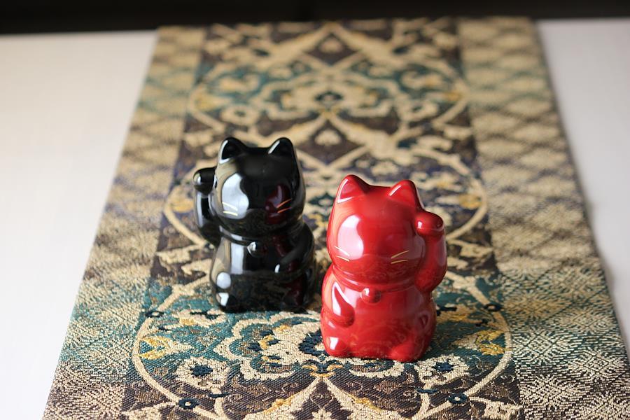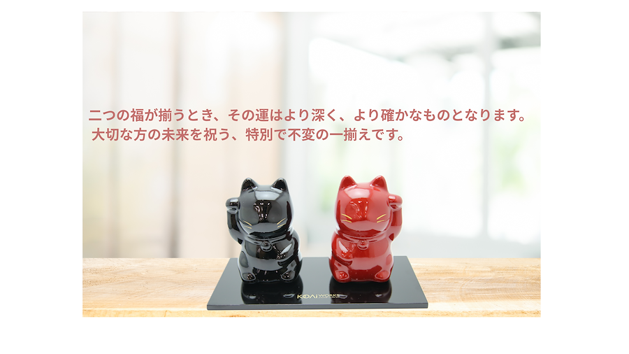 福井県鯖江市に1500年前から伝わる越前漆塗りを施した招き猫です。その昔より越前漆塗りは災いを防ぐと言われ、戦国時代には戦士の鎧兜・甲冑にも漆塗りが多用されました。また日本の神社・仏閣では建屋構造物・鳥居も含め古くから用いられます。KODAI WORKSでは漆塗りアーティストである山内古代氏により、現代の技法も取り入れたJapanese漆ARTという世界観で各種の招き猫に願いの漆膜を形成しています。極薄漆膜を多層に重ねることより、立体物へ透明感や重厚感・光沢感・陰影までも与え漆塗りの命を吹き込んだものです。その多くの漆膜は 各技法・色に意味付けされる願いに変わり招き猫の姿を仮りエネルギーとして感じていただけるものです。日本古来からある最も不変の2色(漆黒・朱赤)。落ち着いた深い黒は深いエネルギーの象徴として神社仏閣に取り入れられています。朱赤は情熱的な赤として6000年前の遺跡よりも発掘された最も愛された縁起カラーとして知られています。いつまでも変わらない健やかな日々を送れる願いが込められているものです。国際輸送基準を満たす 漆塗り製品 安全証明書 付きです。