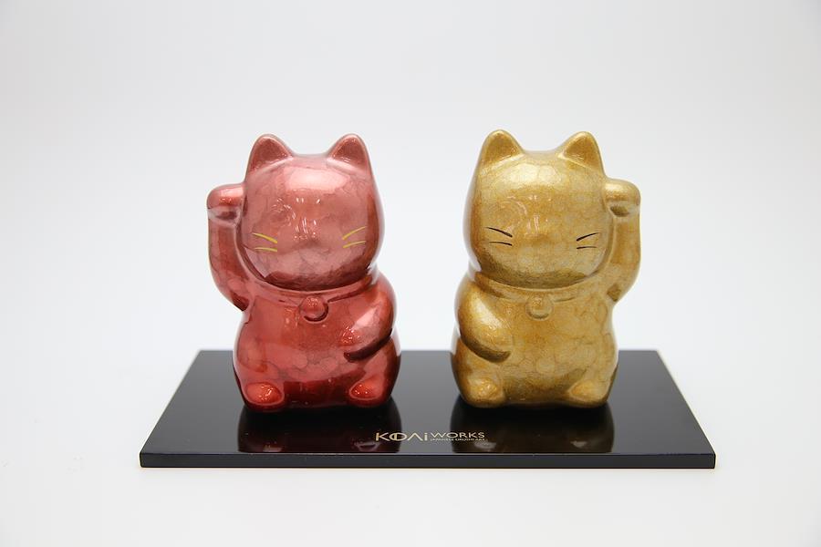 福井県鯖江市に1500年前から伝わる越前漆塗りを施した招き猫です。その昔より越前漆塗りは災いを防ぐと言われ、戦国時代には戦士の鎧兜・甲冑にも漆塗りが多用されました。また日本の神社・仏閣では建屋構造物・鳥居も含め古くから用いられます。KODAI WORKSでは漆塗りアーティストである山内古代氏により、現代の技法も取り入れたJapanese漆ARTという世界観で各種の招き猫に願いの漆膜を形成しています。極薄漆膜を多層に重ねることより、立体物へ透明感や重厚感・光沢感・陰影までも与え漆塗りの命を吹き込んだものです。その多くの漆膜は 各技法・色に意味付けされる願いに変わり招き猫の姿を仮りエネルギーとして感じていただけるものです。蒸雲塗りは地上の水が蒸発し天上へ舞い上がる様を模した漆塗り技法です。気運上昇・恋愛運上昇・事業運上昇など全ての運気をポジティブに上昇させていくエネルギーと願いを込めたものです。手に取れば更にそのエネルギーを感じ取ることができる漆塗り技法です。金色は「金運」「繁栄」「家の守り」といった福を招く意味を託しました。淡紅は「良縁」「家庭円満」「人との和」を願う想いを込めました。 国際輸送基準を満たす 漆塗り製品 安全証明書 付きです。