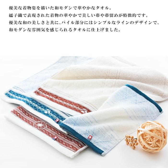 優美な着物姿を描いた和モダンで華やかなタオル。繻子織で表現された着物の華やかで美しい帯や帯留めが特徴的です。優美な和の美しさと共に、パイル部分にはシンプルなラインのデザインで、和モダンな雰囲気を感じられるタオルに仕上げました。