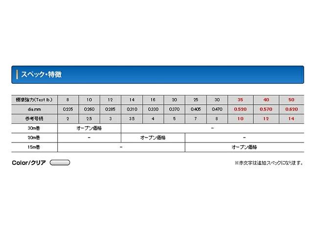 ■号数:2号 30m(8lb) 2.5号 30m(10lb) 3号 30m(12lb) 3.5号 20m(14lb) 4号 20m(16lb) 5号 20m(20lb)