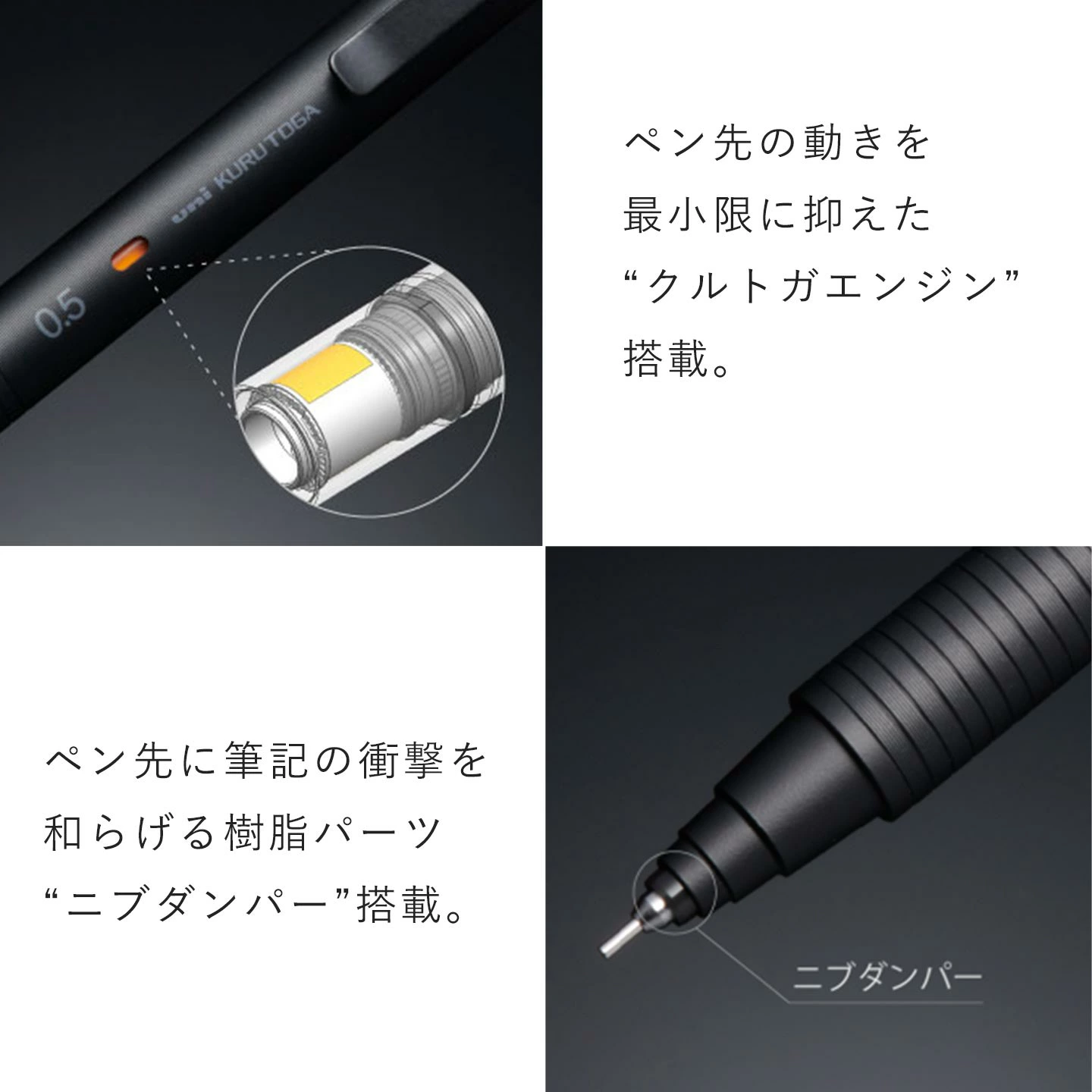 【クルトガ メタル 0.5mm】芯が回ってトガり続ける!シャープペンシルの人気シリーズ『クルトガ』に高級感あるメタルデザインが新登場。落ち着きあるカラーとリッチな質感のブラスト加工を施した軽量アルミボディが美しいデザイン。ペン先の動きを最小限に抑えたクルトガエンジンと筆記の衝撃を和らげるニブダンパー、手に馴染むマイルドエッジグリップで安定した書き味を実現しました。