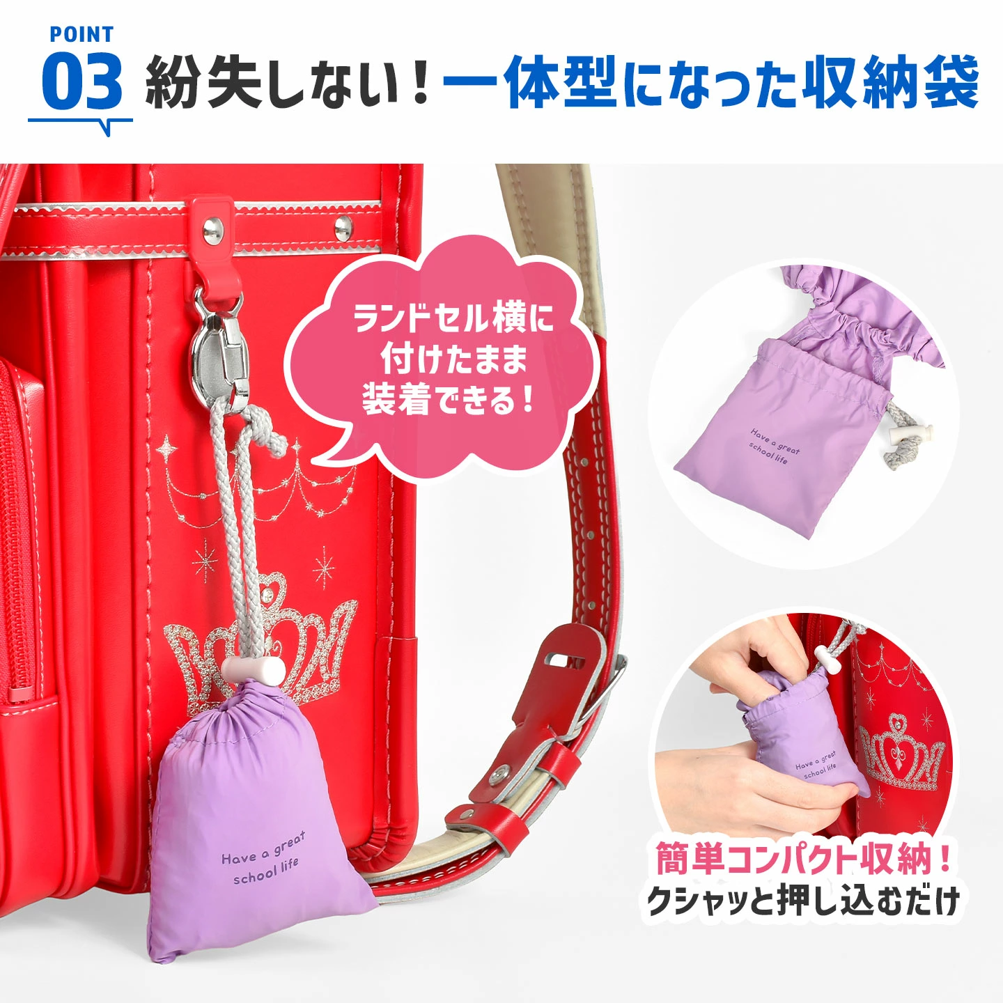 【ランドセルカバー】雨の日も安心!撥水加工のランドセルカバー。サッとかぶせるだけで、ランドセルをしっかりガード。お子さまでも簡単に取り付けられます。カバーを付けることで、隙間からの雨の侵入を防止。突然の雨にも安心です。一体型収納袋付きで、ランドセルに取り付けたままカバーを装着できて便利!紛失防止にも◎さらに、車のライトに反射するリフレクター付きで夜道の安全もサポート。男女問わず使えるデザインが豊富で、通園・通学にぴったりのアイテムです。