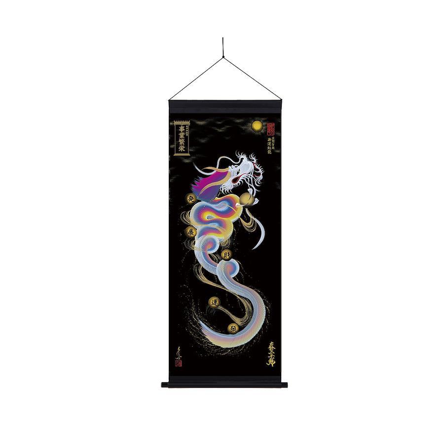 【商品の特徴】・京都一筆龍描画の種類/色彩は【26種】よりお選びいただけます<昇運龍14種(双龍5種/1体龍9種)> <守護龍10種(双龍2種/1体龍8種)> <縁結び龍2種(双龍2種)>・『京都一筆龍の御加護/御利益の象徴=胴体部分を一切途切れさせず一筆で描く動画』のQRコード印字ステッカー(2色/4サイズ)を同封お納めいたしております・描画に記載可能なお願い事は6種のご祈願内容より御選定いただけます心願成就/事業繁栄/金運上昇/健康祈願/家内安全/良縁成就・御札など添付のお祀り用マグネットを使用してお祀り(取り外し/位置変更可能)・発色が良く落ち着いた風合いの防炎スエード生地製(厚み約0.35~ ※官製郵便はがき約1.5枚程度/コピー用紙約4枚分程度)※ スエードは皮革・合成皮革ではなく専用布の名称となります。・吊り下げ用の上下軸棒付き(下部は軸先付き)※軸棒を外して飾られる場合でも、紐や止め具(画鋲、釘、ネジ等)をお使いいただけるハトメ穴付き(表面からは見えません)・丈夫で切れにくくシンプルな風合いの江戸打ち紐付き(黒/白2色)・龍の眼に光を宿し生気を吹き込む『龍の瞳(ラインストーン)』加工・京都一筆龍絵師手島啓輔署名、落款入り・御贈答のご利用も多く、懇切丁寧な包装