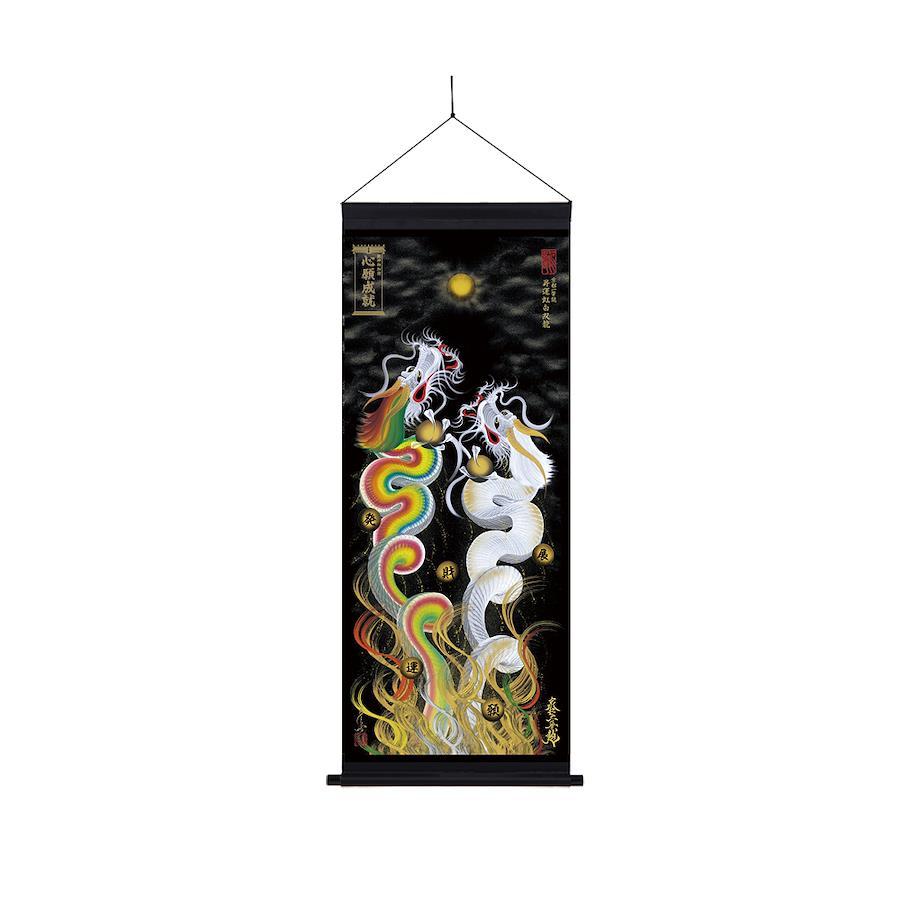 【商品の特徴】・京都一筆龍描画の種類/色彩は【26種】よりお選びいただけます<昇運龍14種(双龍5種/1体龍9種)> <守護龍10種(双龍2種/1体龍8種)> <縁結び龍2種(双龍2種)>・『京都一筆龍の御加護/御利益の象徴=胴体部分を一切途切れさせず一筆で描く動画』のQRコード印字ステッカー(2色/4サイズ)を同封お納めいたしております・描画に記載可能なお願い事は6種のご祈願内容より御選定いただけます心願成就/事業繁栄/金運上昇/健康祈願/家内安全/良縁成就・御札など添付のお祀り用マグネットを使用してお祀り(取り外し/位置変更可能)・発色が良く落ち着いた風合いの防炎スエード生地製(厚み約0.35~ ※官製郵便はがき約1.5枚程度/コピー用紙約4枚分程度)※ スエードは皮革・合成皮革ではなく専用布の名称となります。・吊り下げ用の上下軸棒付き(下部は軸先付き)※軸棒を外して飾られる場合でも、紐や止め具(画鋲、釘、ネジ等)をお使いいただけるハトメ穴付き(表面からは見えません)・丈夫で切れにくくシンプルな風合いの江戸打ち紐付き(黒/白2色)・龍の眼に光を宿し生気を吹き込む『龍の瞳(ラインストーン)』加工・京都一筆龍絵師手島啓輔署名、落款入り・御贈答のご利用も多く、懇切丁寧な包装