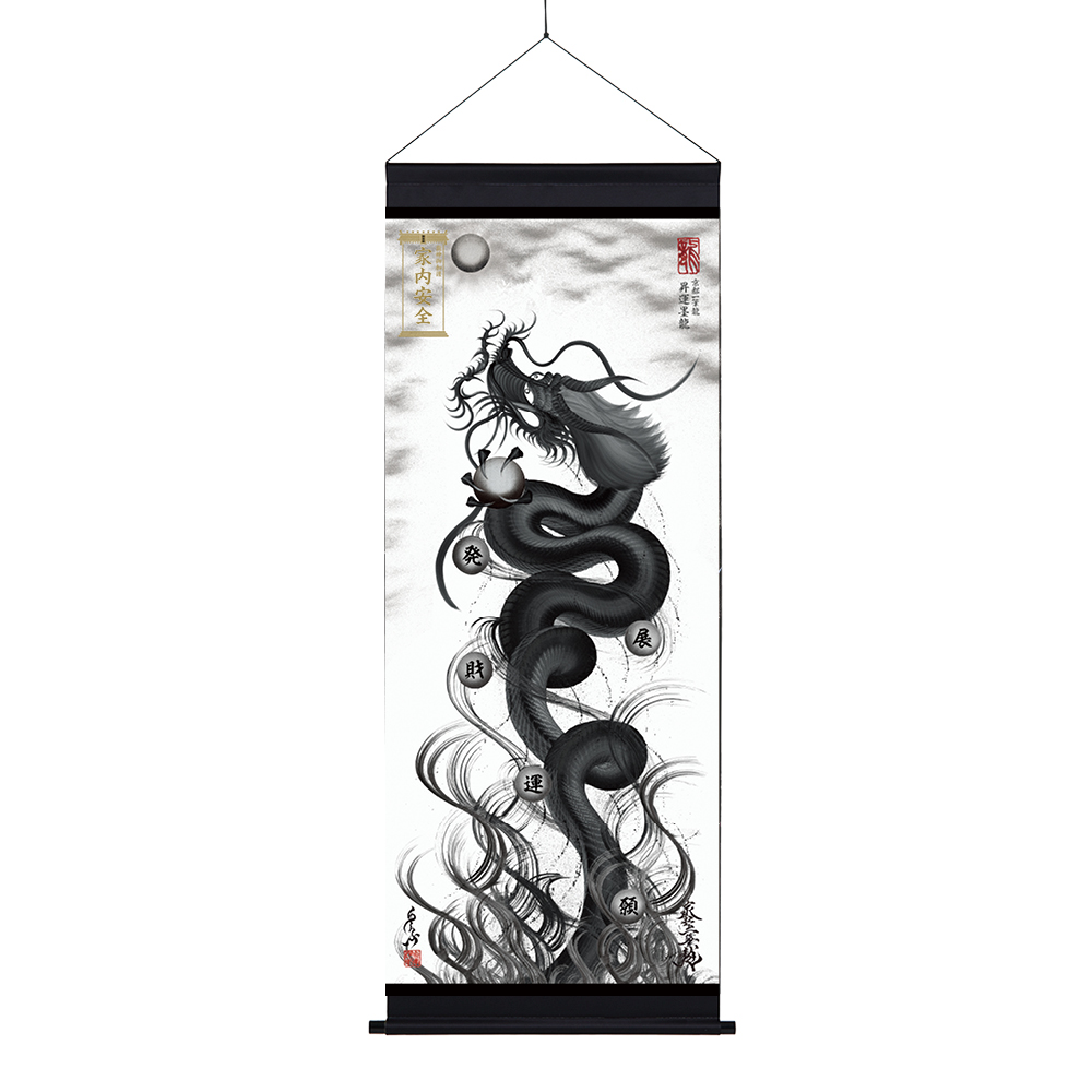 【商品の特徴】・京都一筆龍描画の種類/色彩は【26種】よりお選びいただけます<昇運龍14種(双龍5種/1体龍9種)> <守護龍10種(双龍2種/1体龍8種)> <縁結び龍2種(双龍2種)>・『京都一筆龍の御加護/御利益の象徴=胴体部分を一切途切れさせず一筆で描く動画』のQRコード印字ステッカー(2色/4サイズ)を同封お納めいたしております・描画に記載可能なお願い事は6種のご祈願内容より御選定いただけます心願成就/事業繁栄/金運上昇/健康祈願/家内安全/良縁成就・御札など添付のお祀り用マグネットを使用してお祀り(取り外し/位置変更可能)・発色が良く落ち着いた風合いの防炎スエード生地製(厚み約0.35~ ※官製郵便はがき約1.5枚程度/コピー用紙約4枚分程度)※ スエードは皮革・合成皮革ではなく専用布の名称となります。・吊り下げ用の上下軸棒付き(下部は軸先付き)※軸棒を外して飾られる場合でも、紐や止め具(画鋲、釘、ネジ等)をお使いいただけるハトメ穴付き(表面からは見えません)・丈夫で切れにくくシンプルな風合いの江戸打ち紐付き(黒/白2色)・龍の眼に光を宿し生気を吹き込む『龍の瞳(ラインストーン)』加工・京都一筆龍絵師手島啓輔署名、落款入り・御贈答のご利用も多く、懇切丁寧な包装
