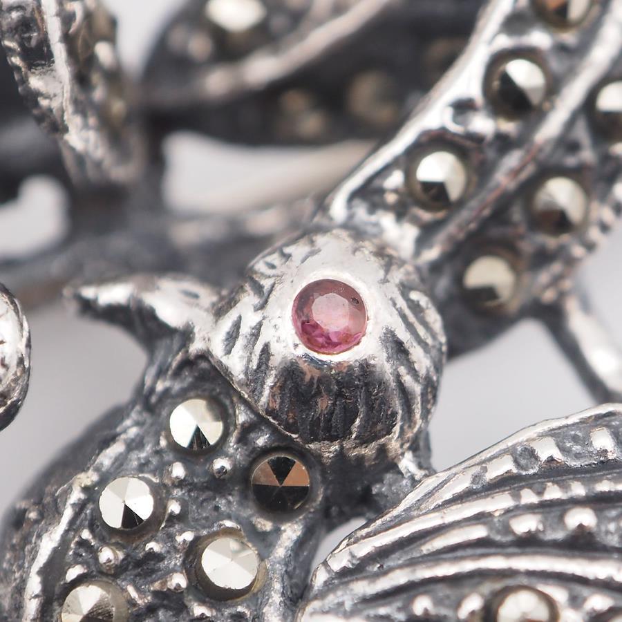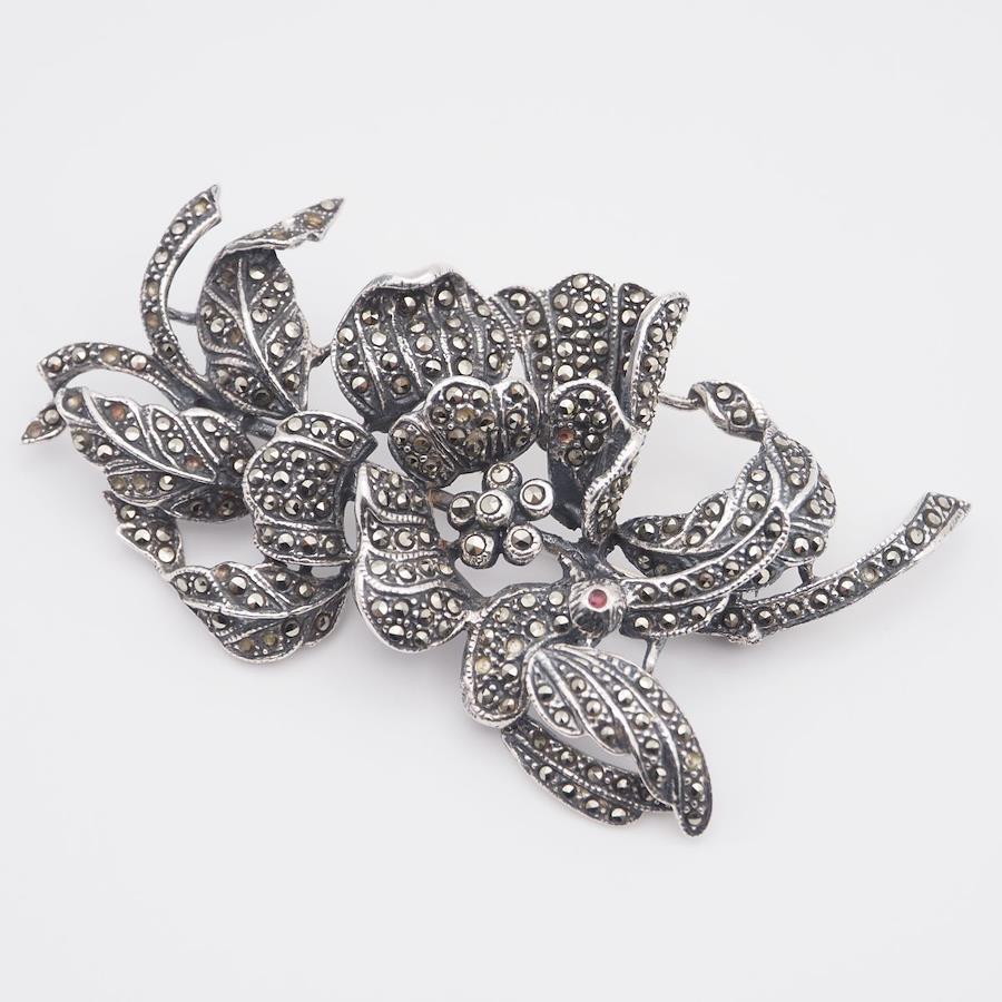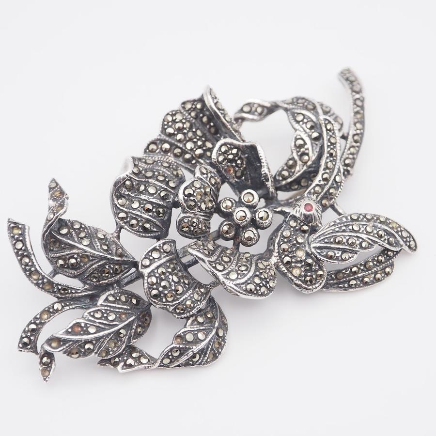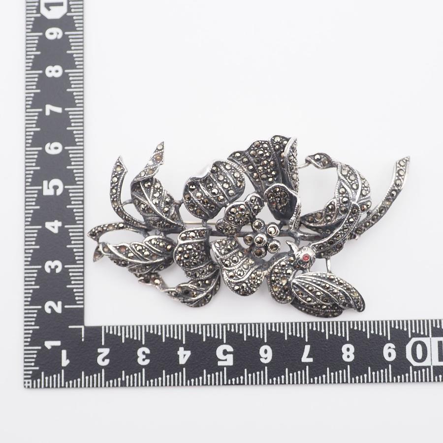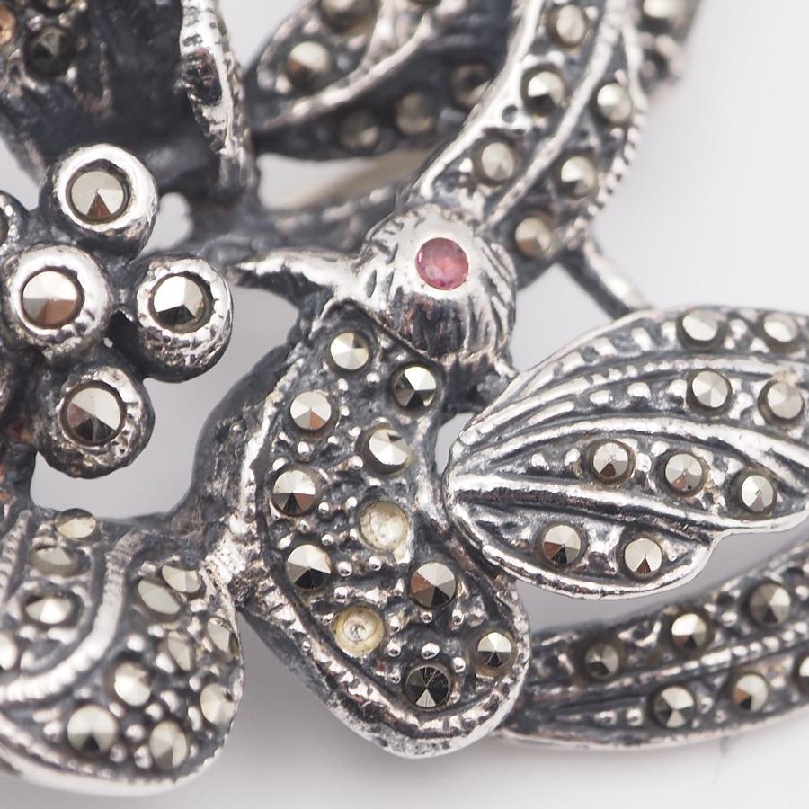 L297 Marcasite and Pink Stone Brooch, Stamped 925, Large, Flower and Bird Design, Silver, Vintage