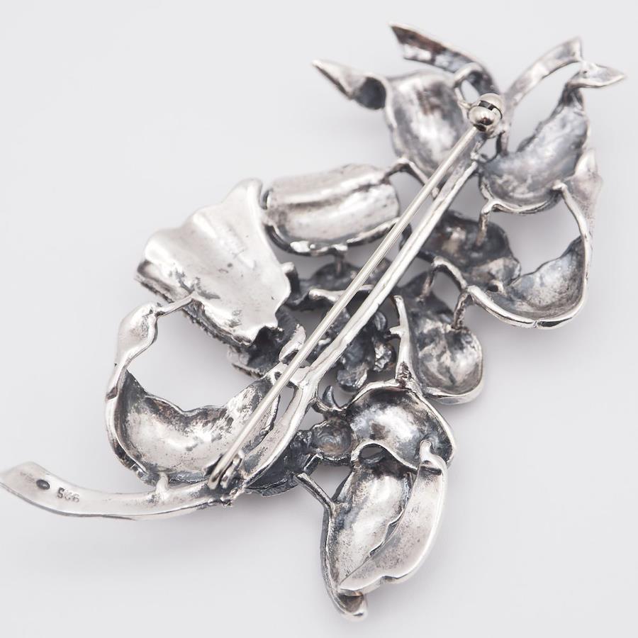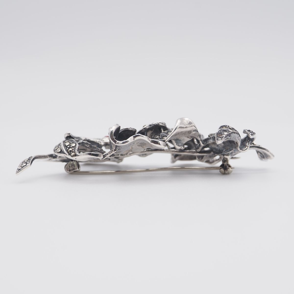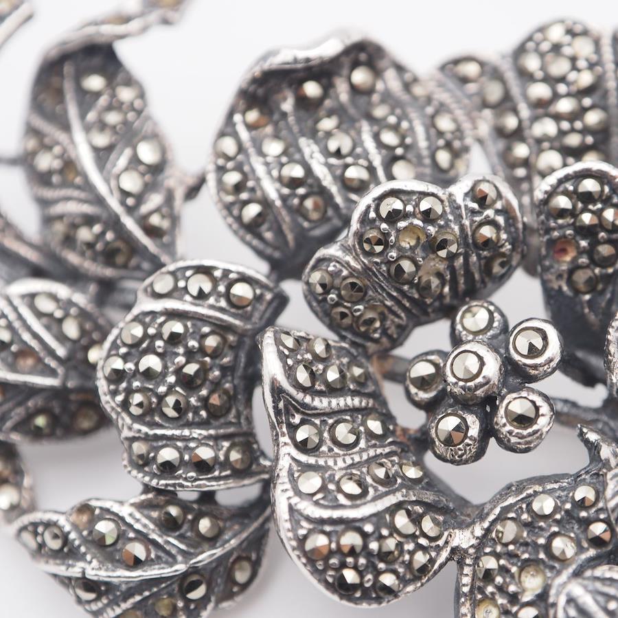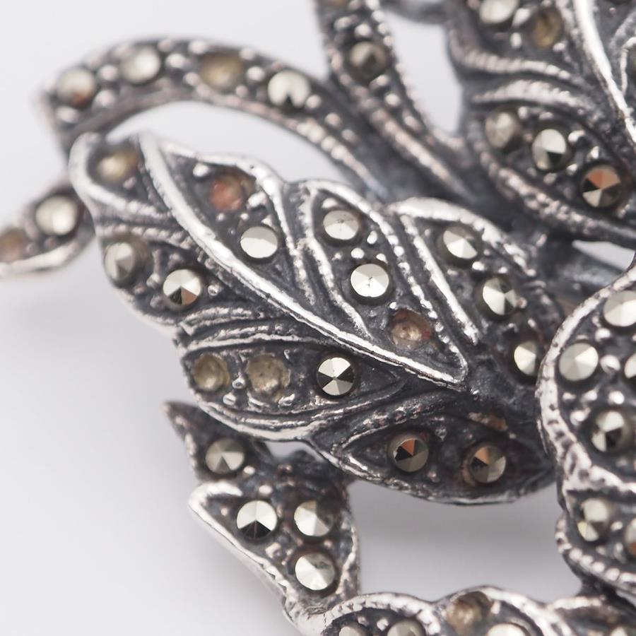 L297 Marcasite and Pink Stone Brooch, Stamped 925, Large, Flower and Bird Design, Silver, Vintage