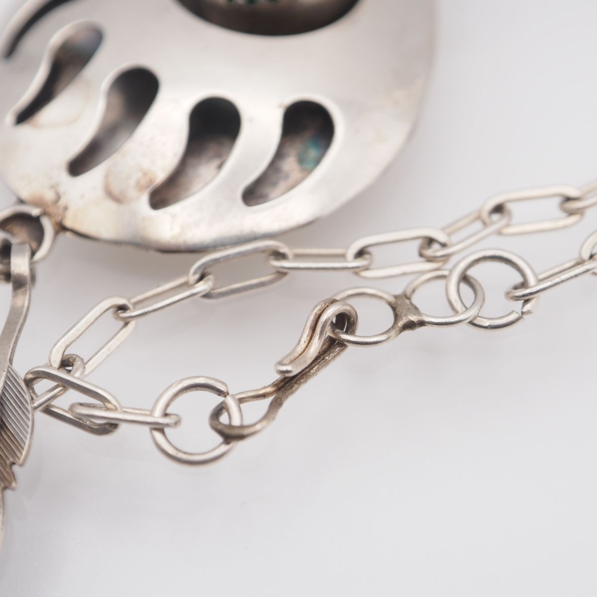 おそらく銀製かと思いますが、刻印が無いため断言できません。画像をたくさん掲載しておりますのでそちらでご確認とご判断をお願いいたします。
