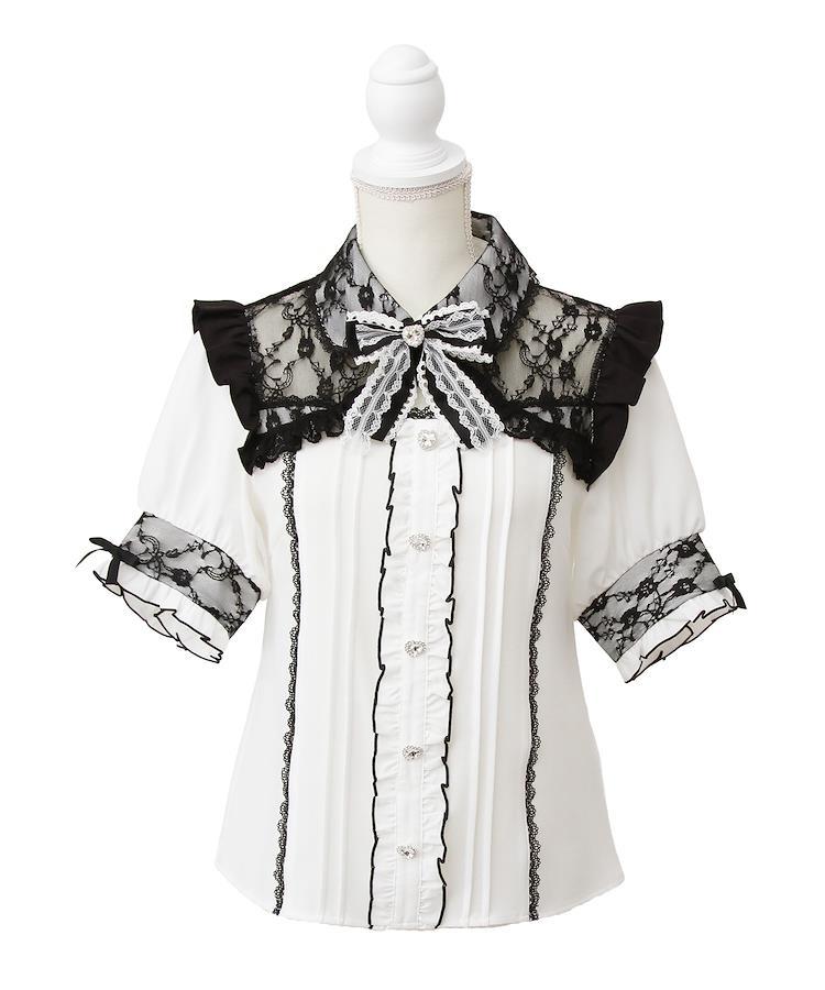 襟とカフスはレース重ね、肩回りはかわいく透け感があるレース切替デザインのブラウスです。