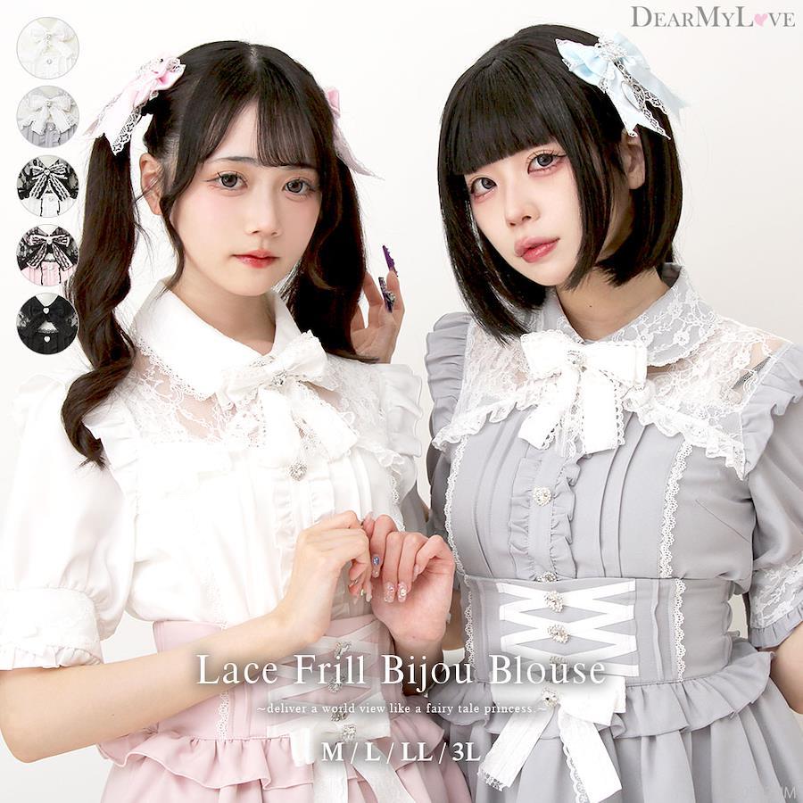 襟とカフスはレース重ね、肩回りはかわいく透け感があるレース切替デザインのブラウスです。