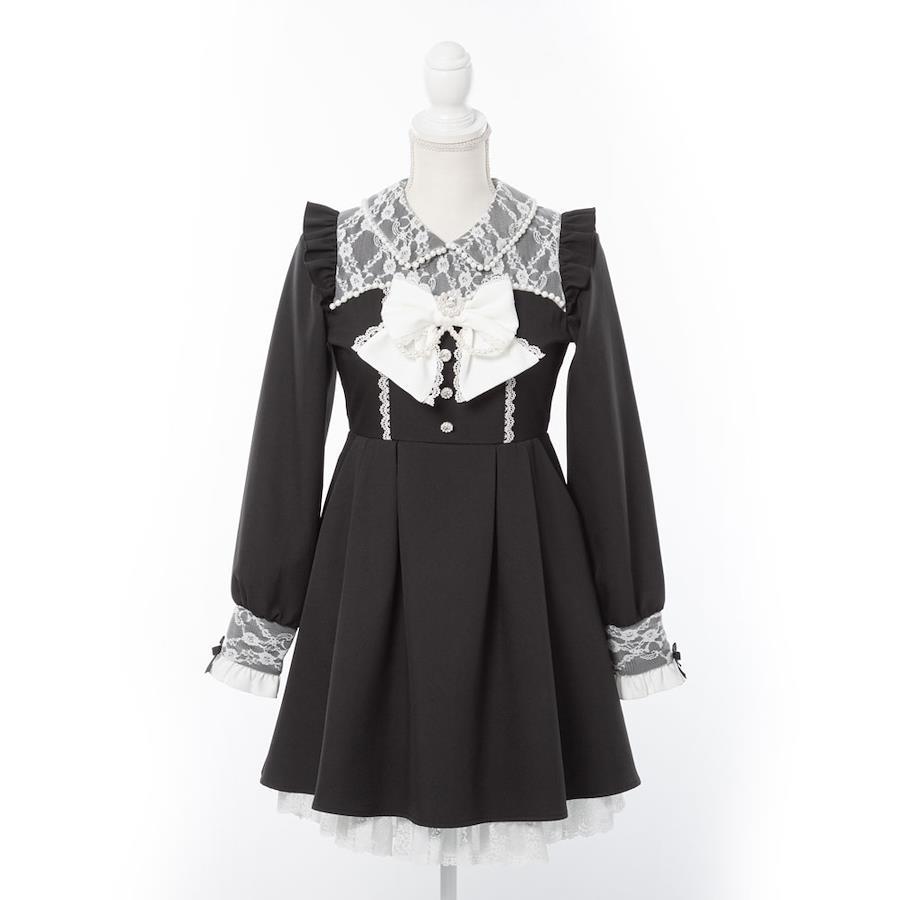襟、身頃にあしらわれたパールがポイントのワンピースです。