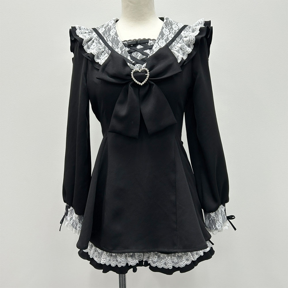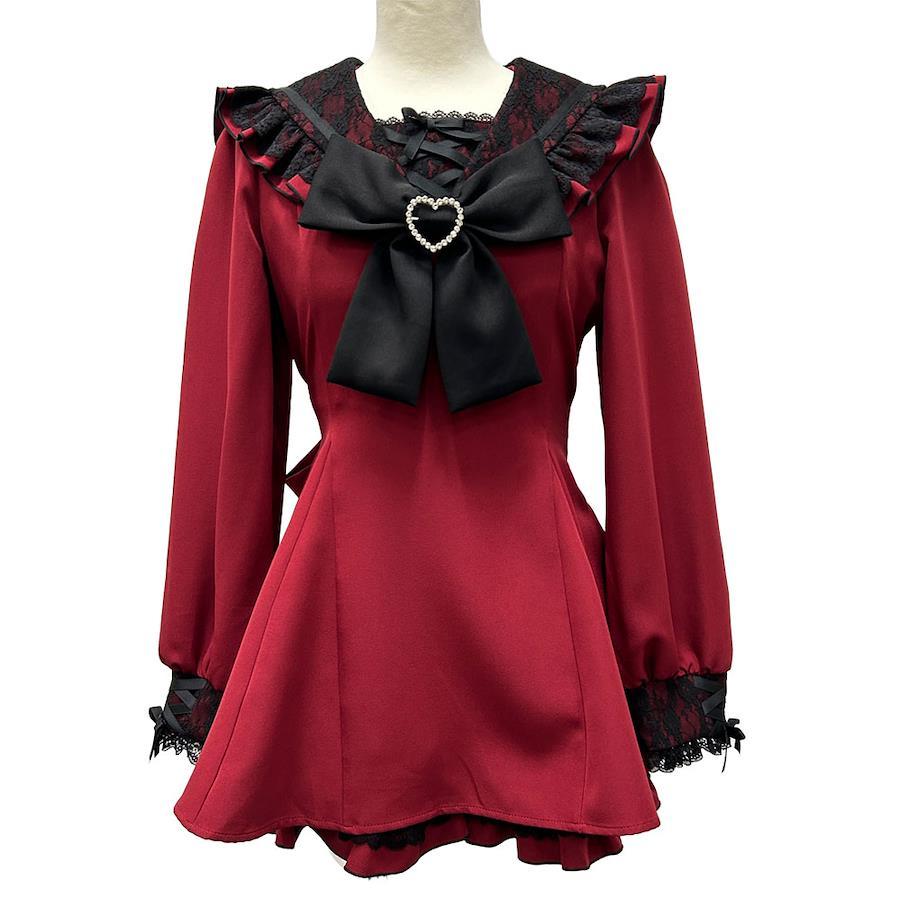 胸当てとカフス部分にはレースアップリボン、胸元にはハートのキラキラバックルが輝くリボン付き。