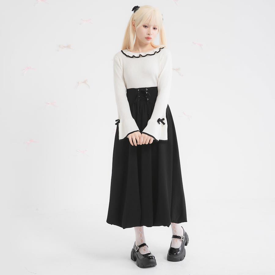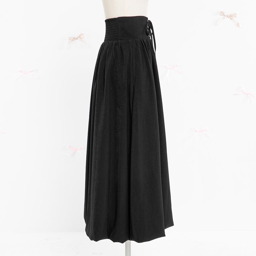ふんわりとしたシルエットが可愛いバルーンロングスカートのご紹介。【デザイン】フロントのレースアップデザインがアクセントのロングスカート。シンプルながら、トレンドのバルーンシルエットがガーリーさをプラス。コルセットのようにウエスト切替巾が広めなので、きゅっ、ふわっのメリハリシルエットが叶います♪後ろウエストはシャーリングゴムになっており、着心地も楽ちんです♪レースアップ部分はご自身で結ぶ仕様なので、少しですがきゅっと締めてウエストも調整も可能です。