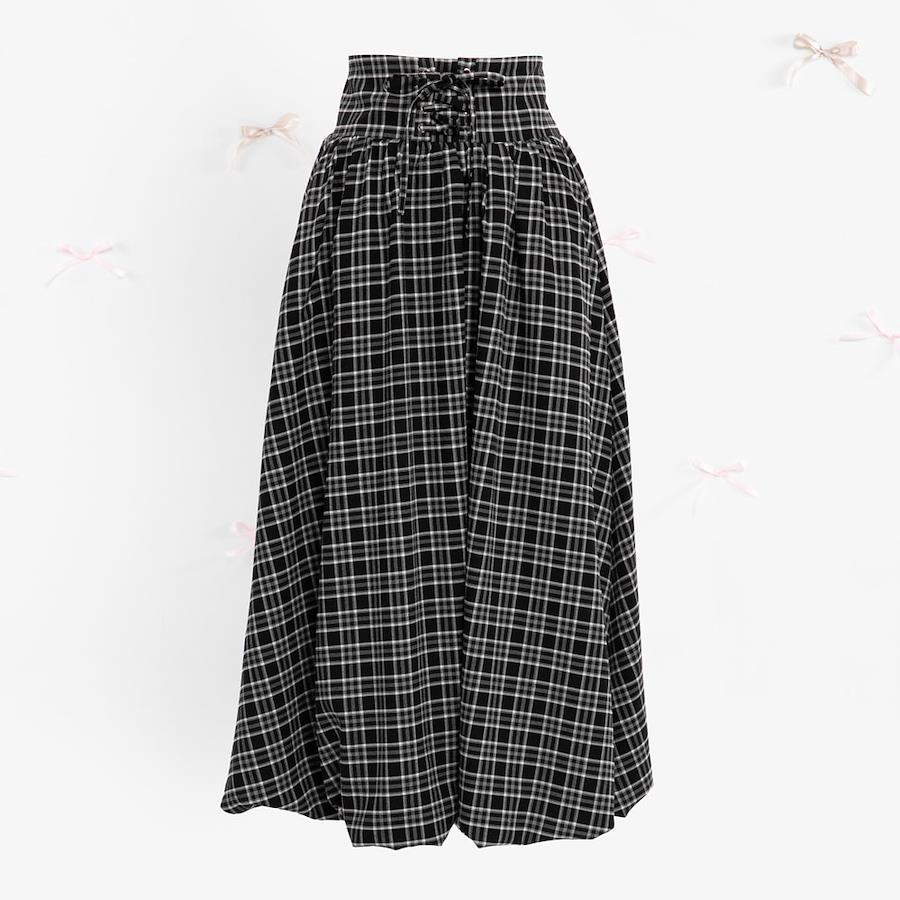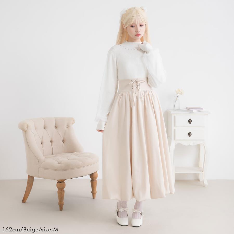 ふんわりとしたシルエットが可愛いバルーンロングスカートのご紹介。【デザイン】フロントのレースアップデザインがアクセントのロングスカート。シンプルながら、トレンドのバルーンシルエットがガーリーさをプラス。コルセットのようにウエスト切替巾が広めなので、きゅっ、ふわっのメリハリシルエットが叶います♪後ろウエストはシャーリングゴムになっており、着心地も楽ちんです♪レースアップ部分はご自身で結ぶ仕様なので、少しですがきゅっと締めてウエストも調整も可能です。
