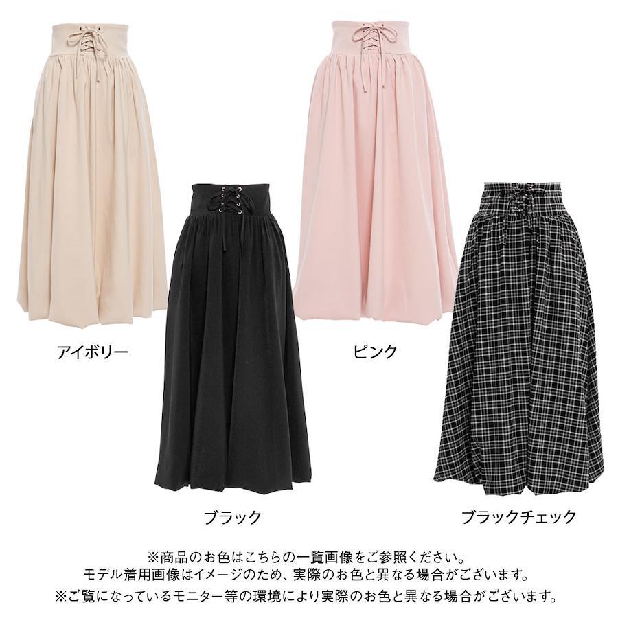 ふんわりとしたシルエットが可愛いバルーンロングスカートのご紹介。【デザイン】フロントのレースアップデザインがアクセントのロングスカート。シンプルながら、トレンドのバルーンシルエットがガーリーさをプラス。コルセットのようにウエスト切替巾が広めなので、きゅっ、ふわっのメリハリシルエットが叶います♪後ろウエストはシャーリングゴムになっており、着心地も楽ちんです♪レースアップ部分はご自身で結ぶ仕様なので、少しですがきゅっと締めてウエストも調整も可能です。