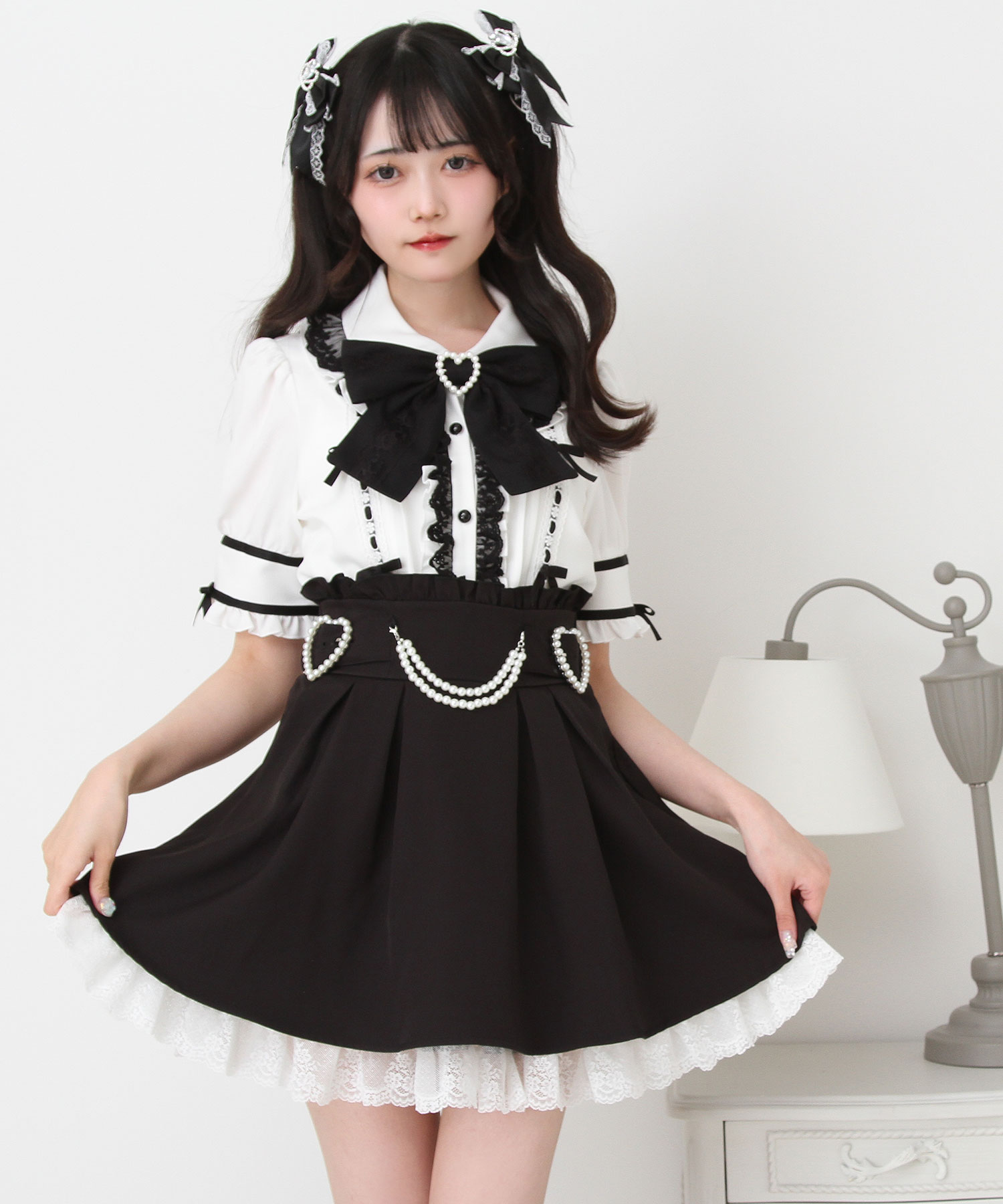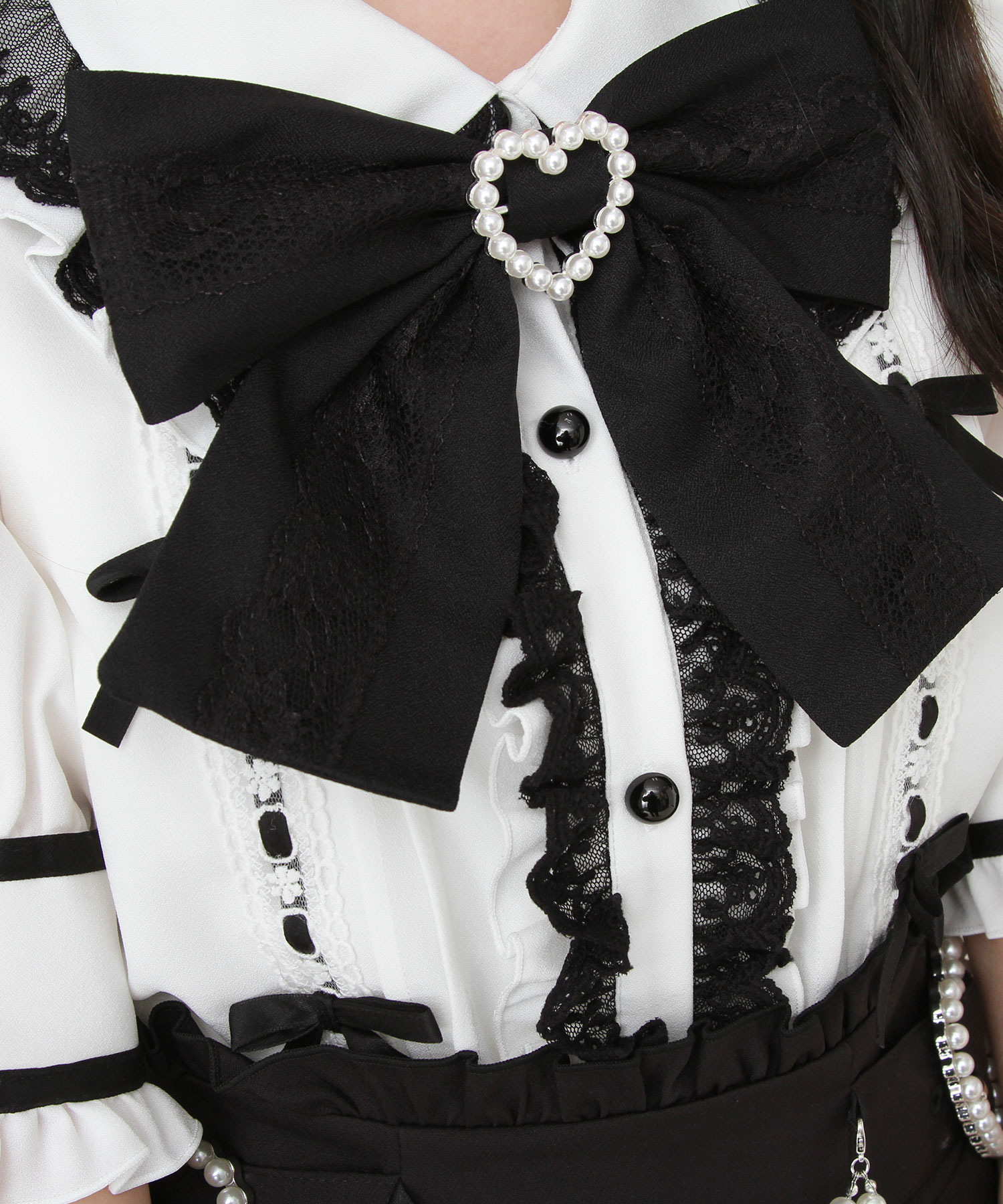 襟元の大きめリボンは取り外しが可能です。ハートパールバックルにレース重ねがポイントに♪