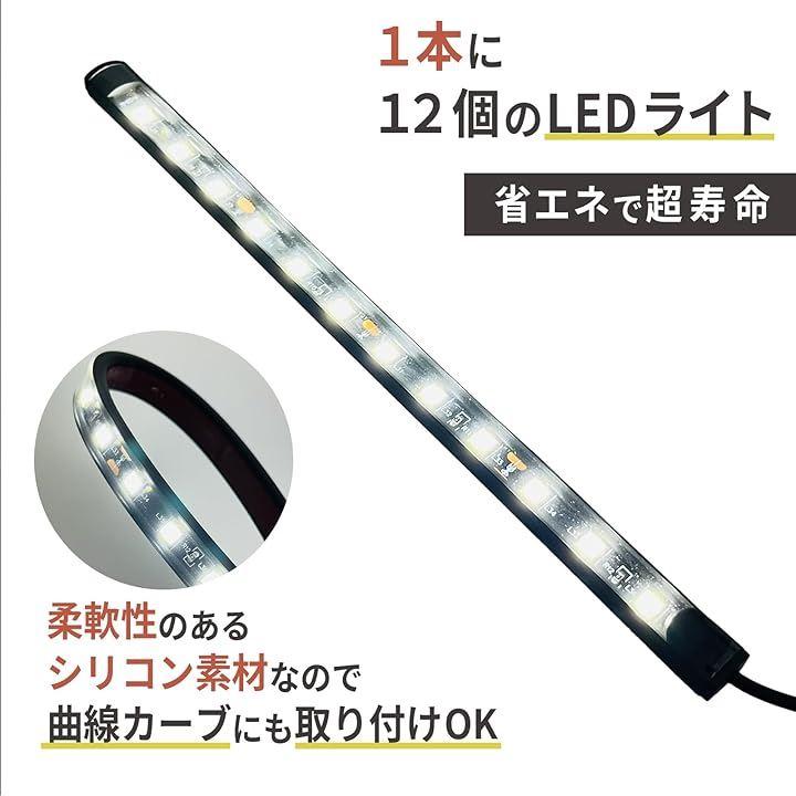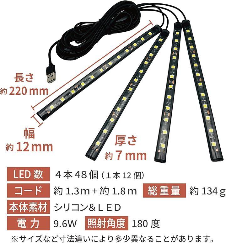 4本のテープライトは、約130cmが2本、約180cmが2本の配線なので、車両の運転席・助手席と後部座席などいろいろな場所に設置しやすくなっています。
