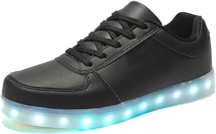 スニーカー内蔵のボタン (USB裏部分)を押すことで靴底のLEDライトが7色の発光パターンとレインボーに光ったり、フラッシュしたり4パターンの光り方でかなり目立つスニーカーです。