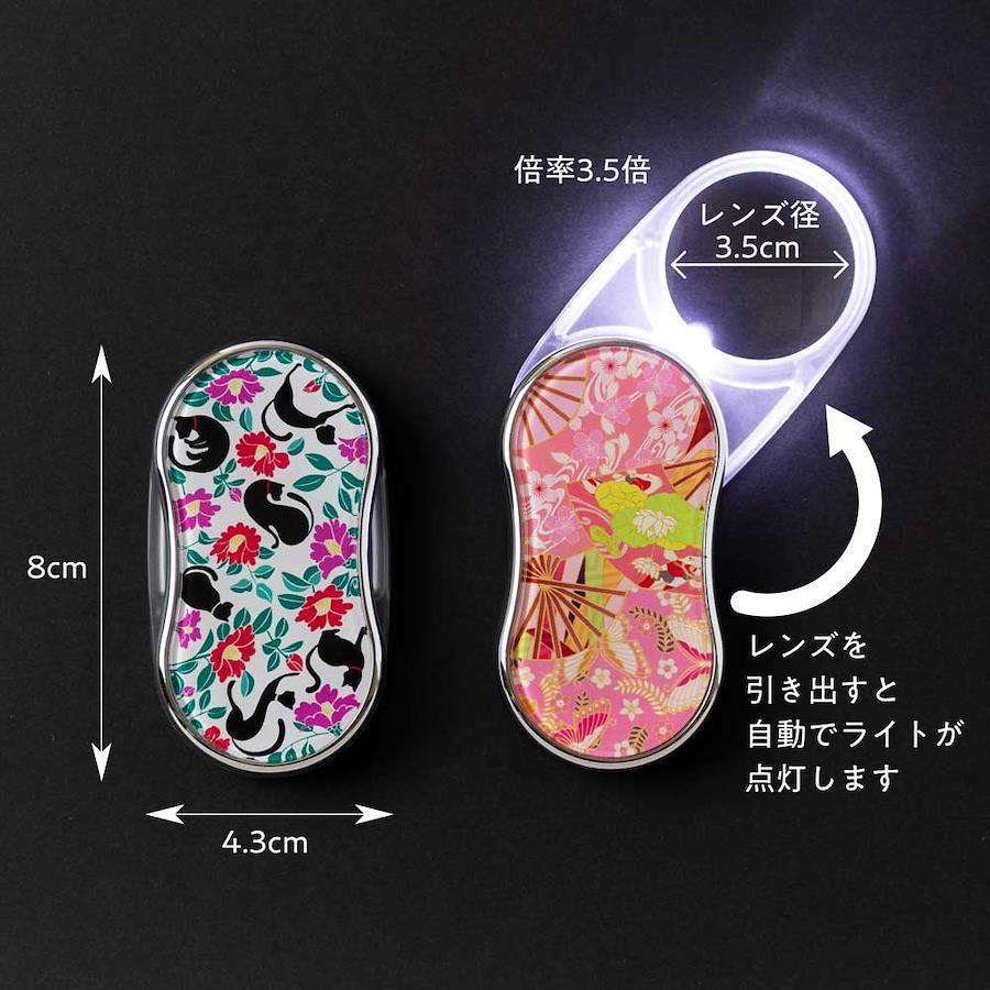 女性的なデザインで人気の、持ち運びに便利なポケットサイズのルーペです。小さな文字をちょっと確認したい時や、出先で商品の説明書きを見たい時など、老眼鏡をわざわざ取り出すまでもないようなシーンで大活躍。レンズを引き出すと自動でライトが点灯するので、薄暗い場所でもはっきり見ることができます。