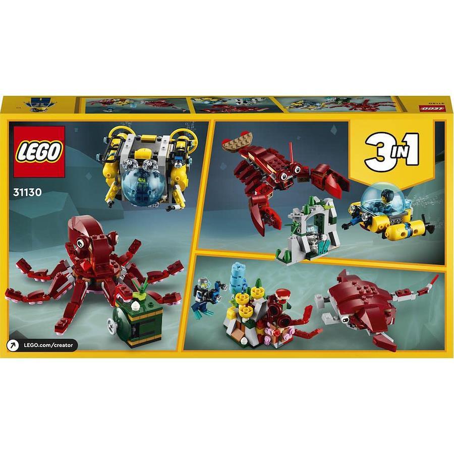 海の秘宝探検(31130)は、潜水艦、巨大タコ、ミニフィギュア2体、金塊や宝物の入った金庫などを使って、スリル満点の海底探検ごっこを楽しめます。
