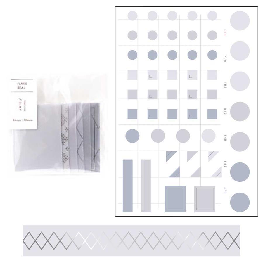 マスキングテープ:5mm幅・長さ5mシール(マンスリーシート):W102×H150mmフレークシール:W50×H70mm・6種各5枚