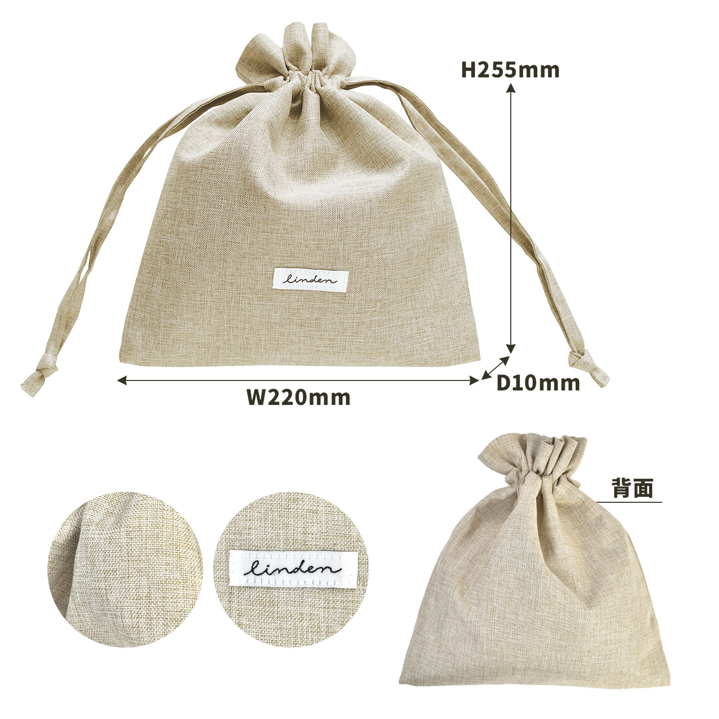 リネン風の生地感と色合いがかわいいシンプルな形の巾着袋。