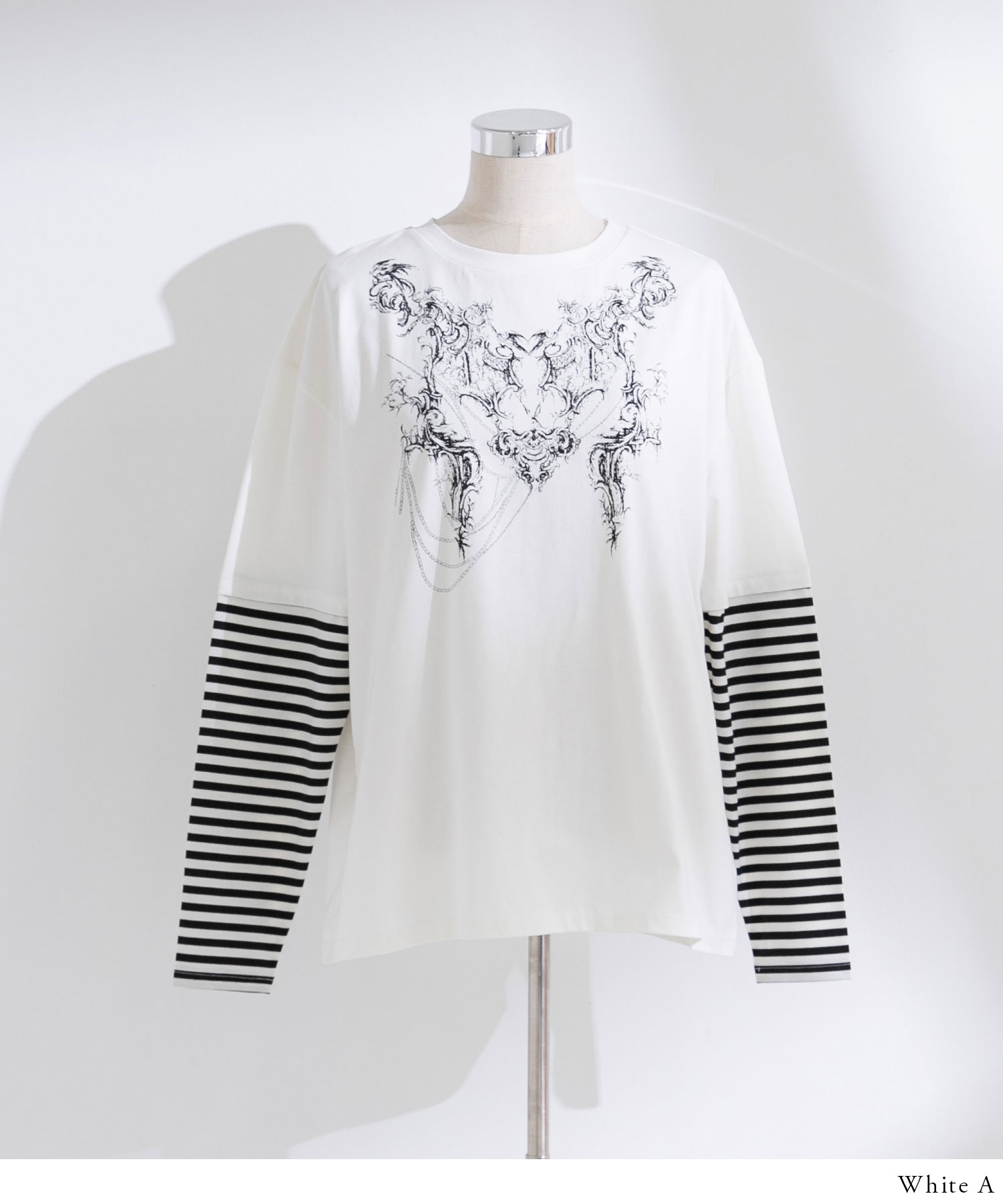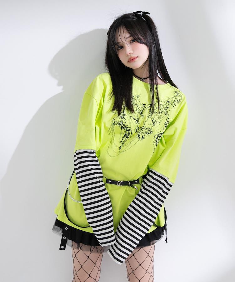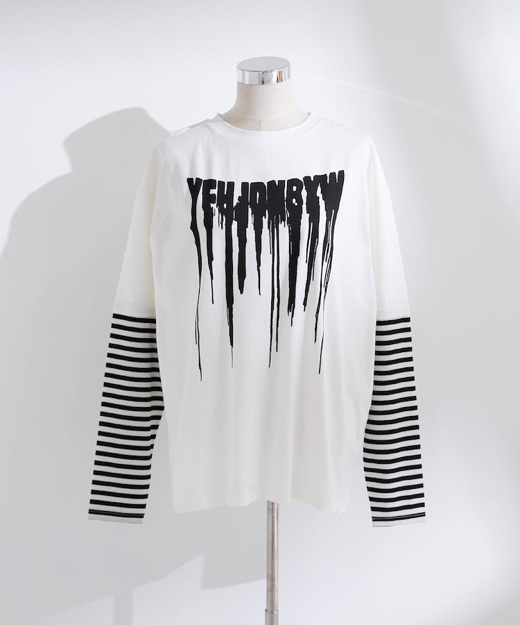 【地雷系ロゴゆるT×ボーダー長袖レイヤード風カットソー、