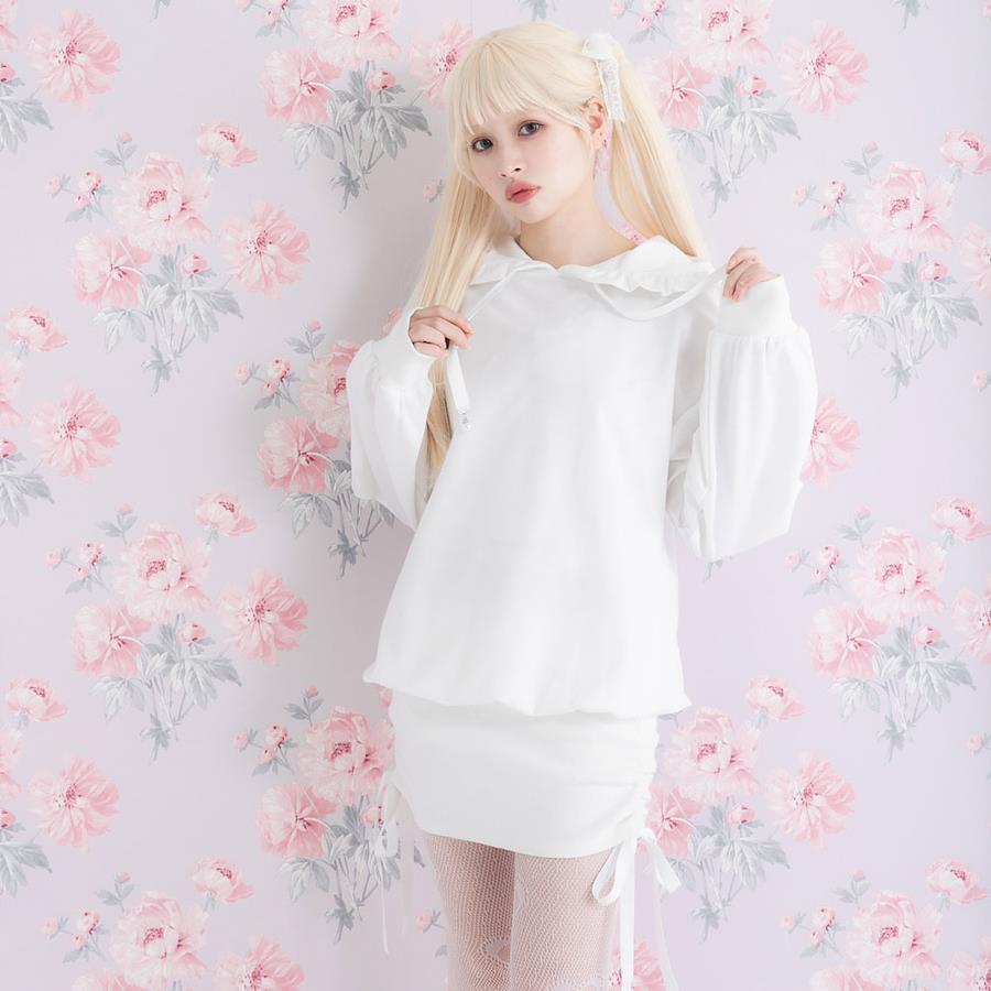 襟が選べる♪トレンドライクなスウェットミニワンピースのご紹介。【デザイン】ゆる×ピタな絶妙あざとシルエットがトレンド感抜群なスウェットワンピースです。フード襟かセーラー襟の2種類からお好みの襟タイプを選べます♪ボリューミーなお袖やゆるっと脱力感のある上半身と、ピタッと引き締めてくれるミニ丈シルエットがメリハリをつけてくれてスタイルUP効果も抜群◎スウェット生地でラフな印象なのに、可愛いらしさ+女っぽく着れちゃいます♪パーカーのリボン先にはパールチャームがついているので、コーデのワンポイントに◎伸縮性のある生地なので、被りで着用いただける仕様です。スカートのサイドドロスト部分はお好みでクシュっと感を調整して頂けます。