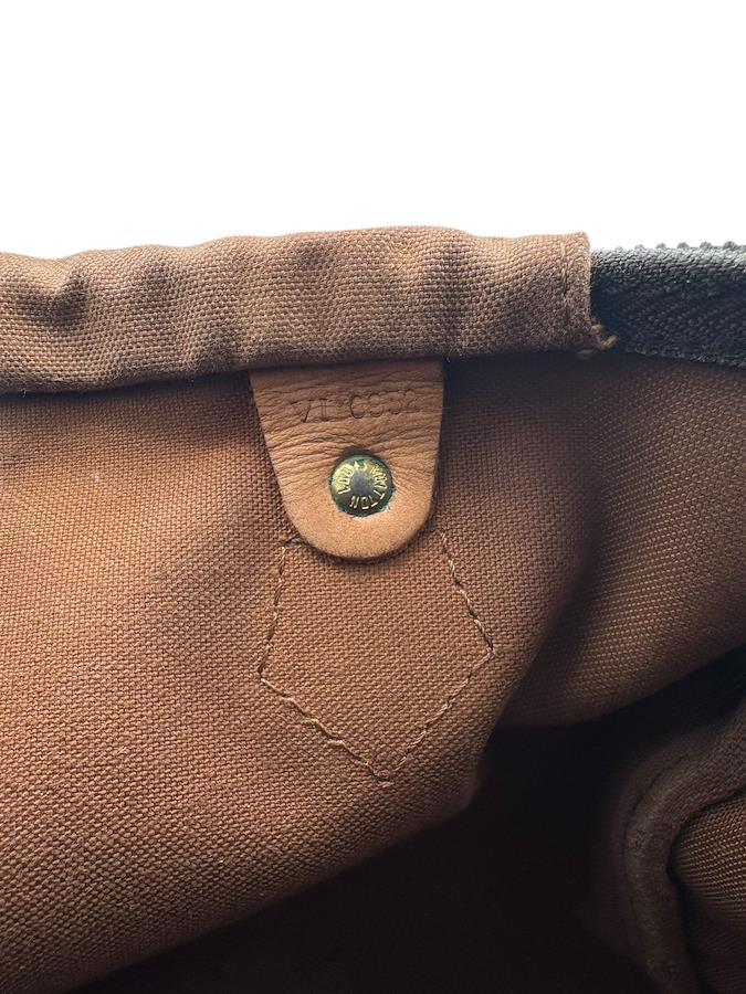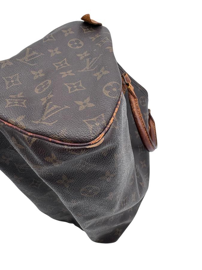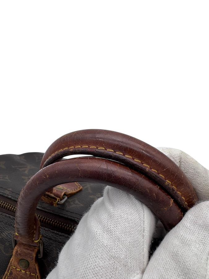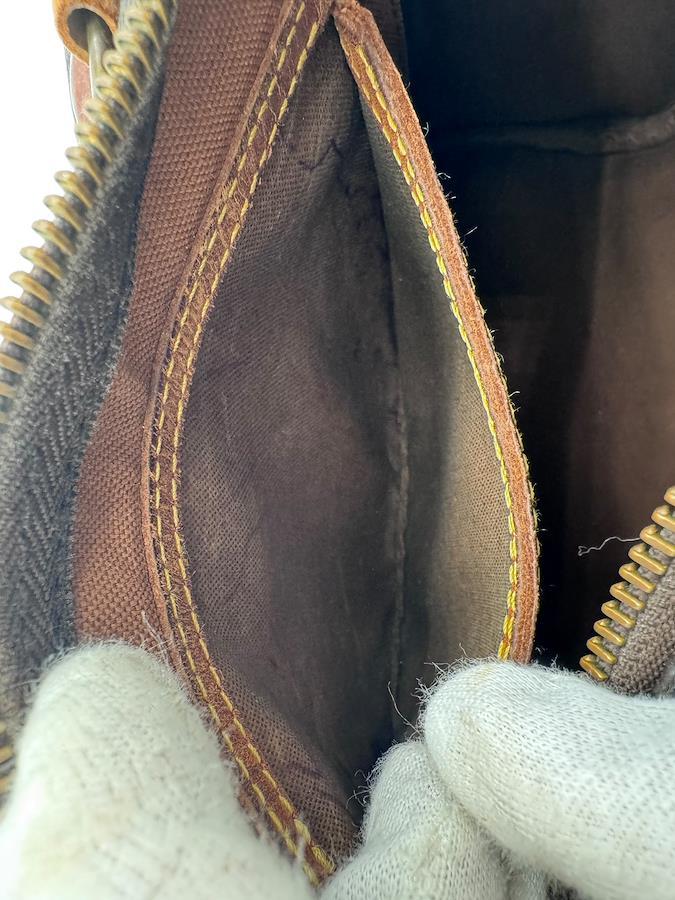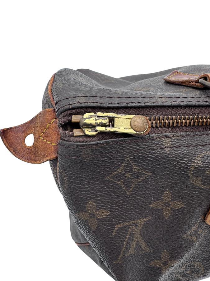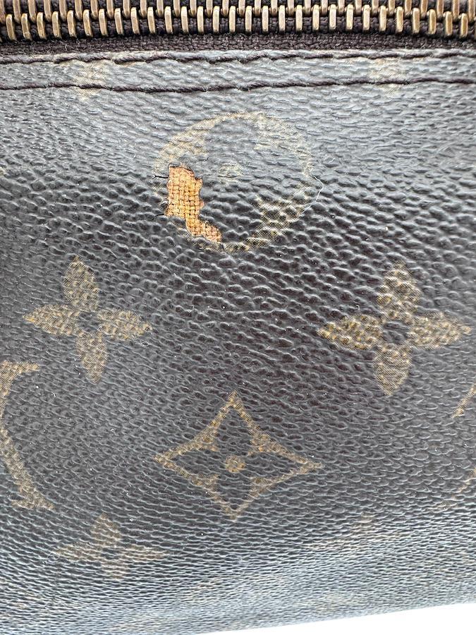 Heavily tanned, stained, darkened, and cracked vachetta leather throughout. Handles particularly darkened. Scuffed corners and piping. Zipper pull plating worn off. One tear in the Monogram canvas.