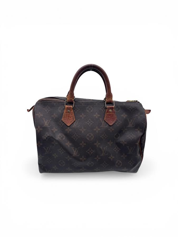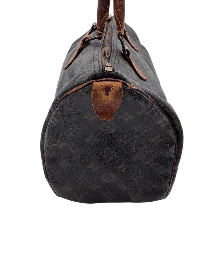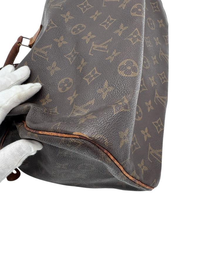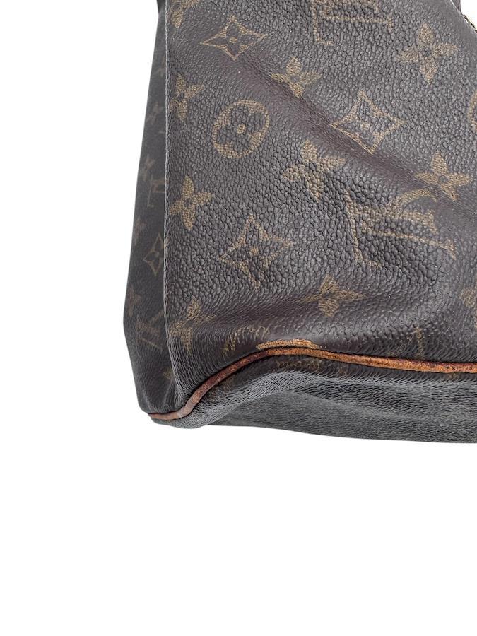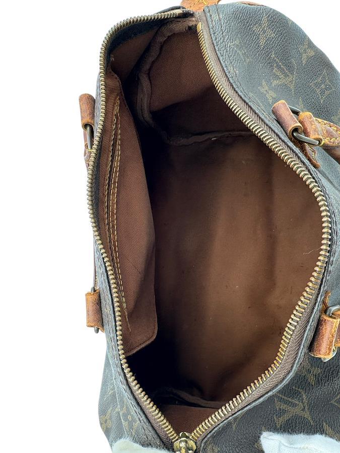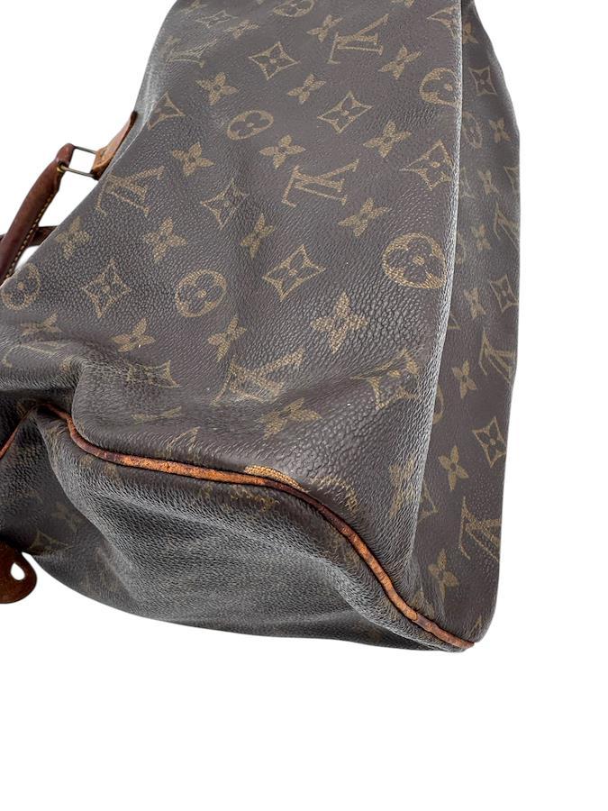 Heavily tanned, stained, darkened, and cracked vachetta leather throughout. Handles particularly darkened. Scuffed corners and piping. Zipper pull plating worn off. One tear in the Monogram canvas.
