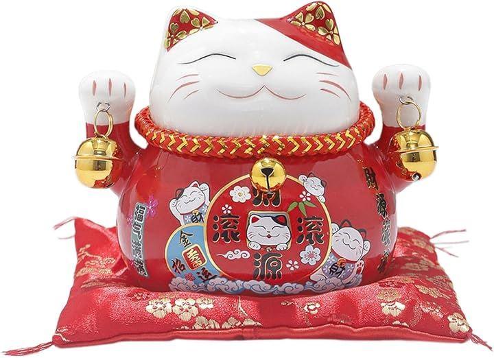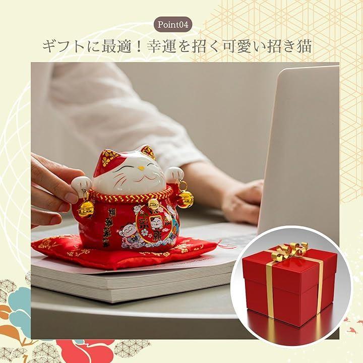 両手上げで運気倍増の招き猫の置物:右手で金運「金運招福」、左手で人を招く「千客万来」 両手上げの赤のまねきねこが、あなたに健康、富、知識、そして幸運をもたらします。