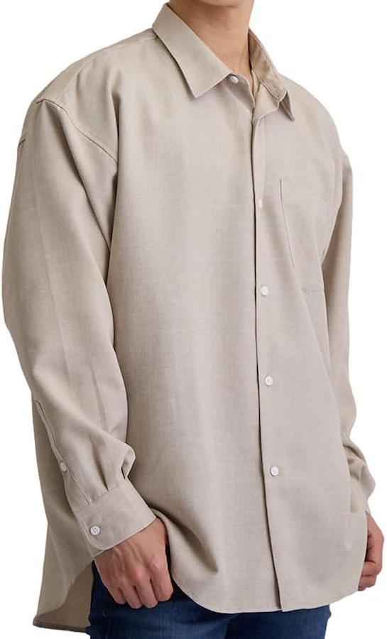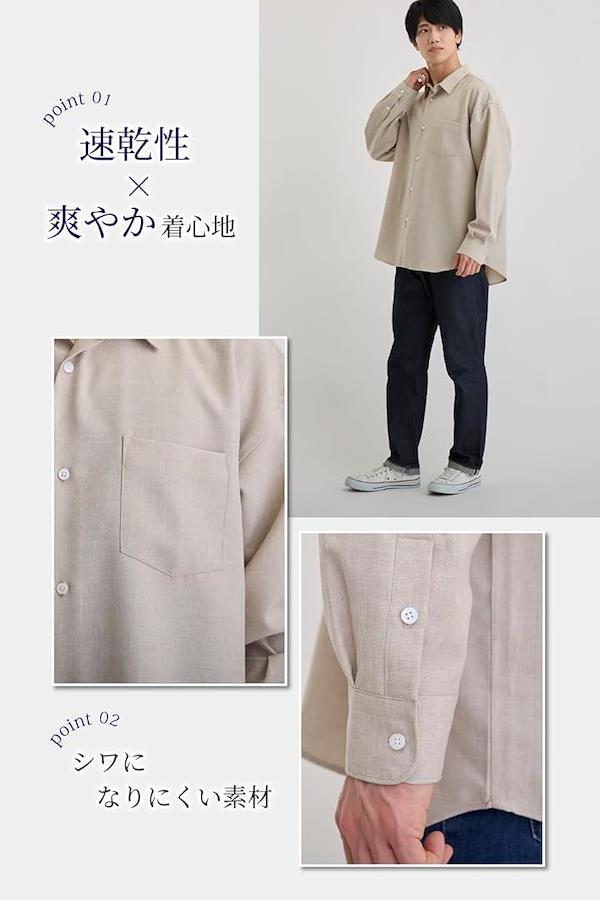 「上質感あふれる長袖メンズシャツ」リネンシャツのような生地感があり、その一方できちんと感と清潔感も兼ね備え、紳士服のように大人の雰囲気を引き立てます。
