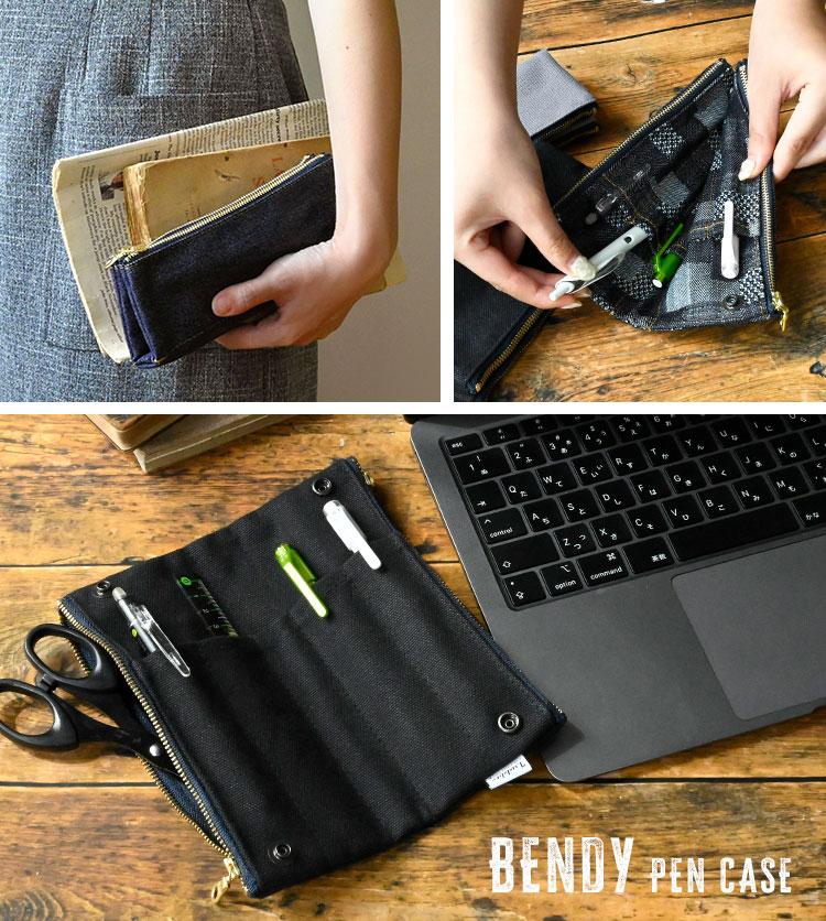 【ベンティペンケース】機能とデザインの融合で人気のラダイト 「ベンディペンケース」。開くとペンを1本ずつ収納できるようになっており、よく使うペンの位置をすぐに把握できます。ファスナーは信頼のYKK製でスムーズに開閉可能。素材は岡山デニムと倉敷帆布の2種類の素材からお選びいただけます。