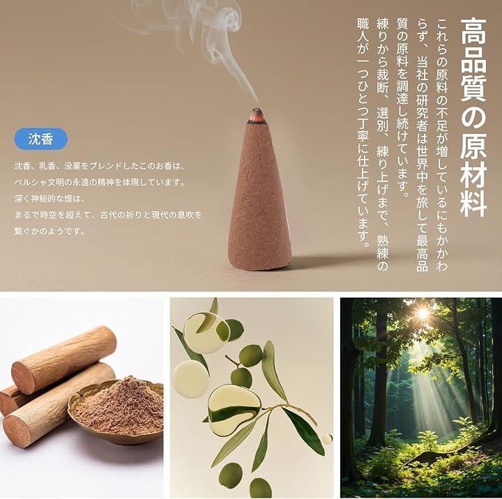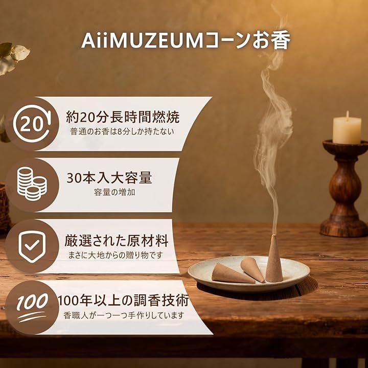 「約20分長時間燃焼」一般的なお香は8分しか燃焼しませんが、Aiimuzeumのコーン型は20分以上燃焼するため、スピリチュアルな浄化セッションの持続時間を延ばすことができます。
