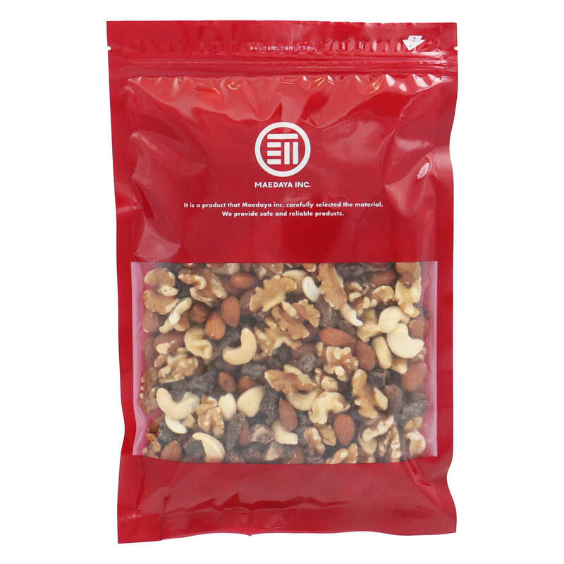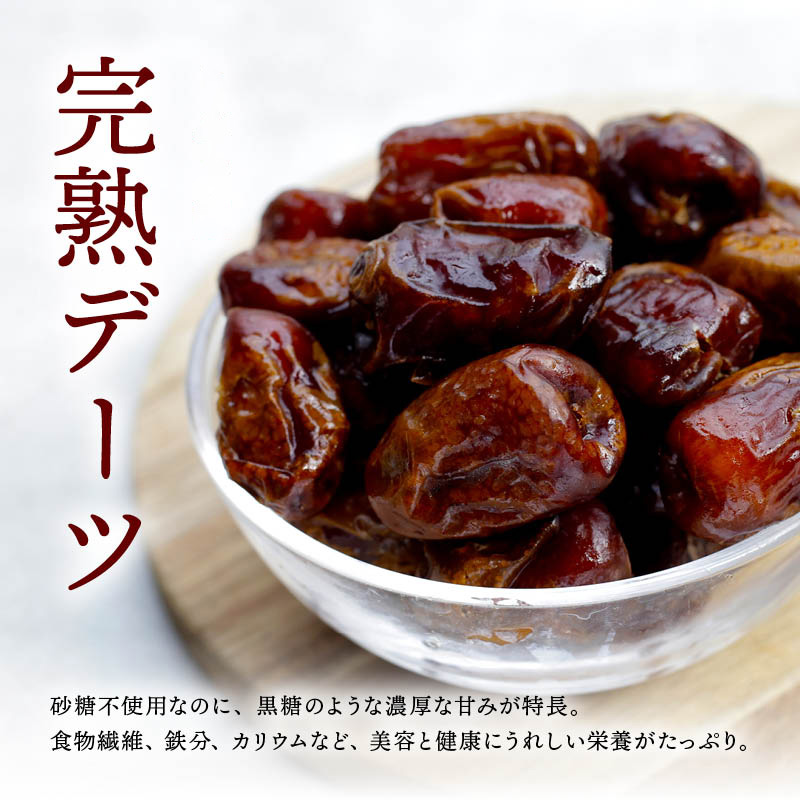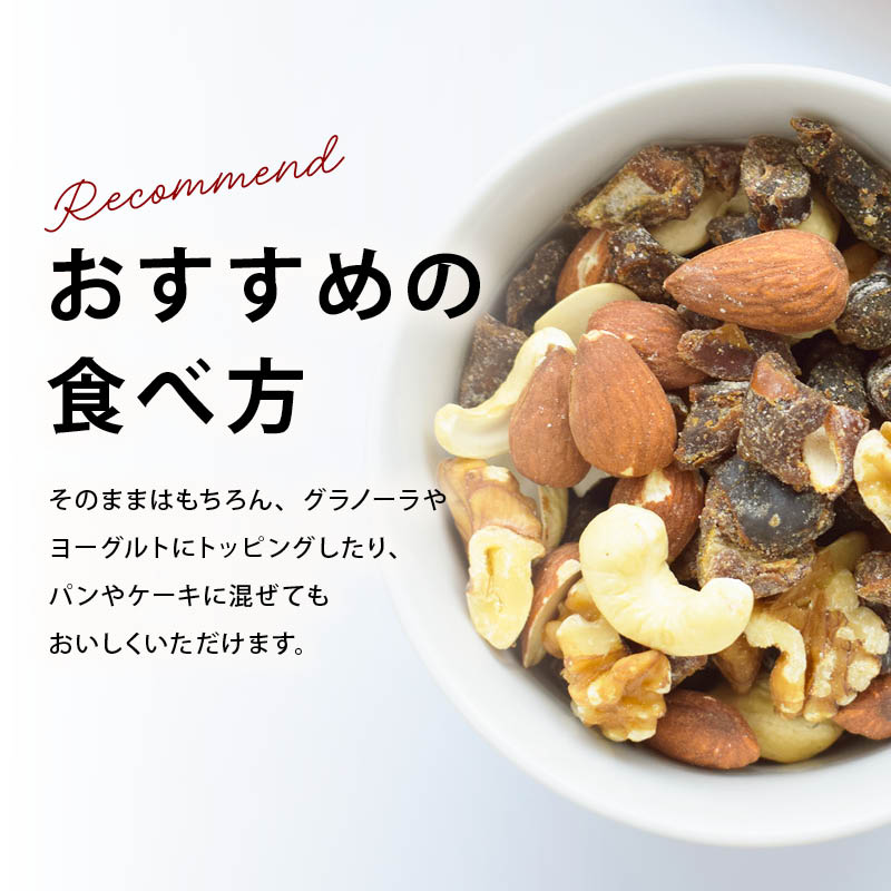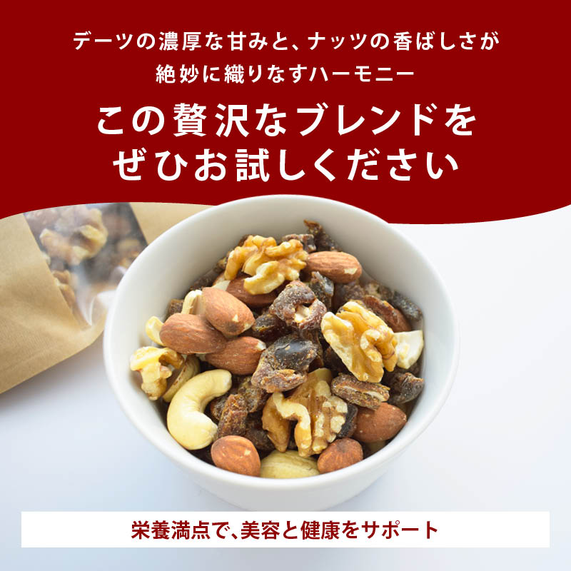 前田家でロングセラー3種類のナッツにデーツダイスをミックス!美味しさも栄養もプレミアムなミックスナッツです。無添加・無塩・無油で美容と健康をサポートします。商品説明ブロック美容意識の高いあなたへ注目のスーパーフルーツ「デーツ」と3種のナッツが織りなす、美と健康のための贅沢なブレンド【完熟デーツ】砂糖不使用なのに、黒糖のような濃厚な甘みが特長。食物繊維、鉄分、カリウムなど、美容と健康にうれしい栄養がたっぷり。【デーツに含まれる豊富な鉄分】肌にツヤとハリを与え、貧血予防に役立ちます。食物繊維が腸内環境を整え、美肌効果も期待できます。【無添加・無塩・無油のナッツ3種】3種のナッツが、さらに栄養価を高め、美容と健康をサポート。・アーモンド:ビタミンEが豊富で、抗酸化作用が期待できます。・クルミ:オメガ3脂肪酸が豊富で、美肌効果や脳の働きをサポートします。・カシューナッツ:鉄分が豊富で、貧血予防に役立ちます。【おすすめの食べ方】そのままはもちろん、グラノーラやヨーグルトにトッピングしたり、パンやケーキに混ぜてもおいしくいただけます。デーツの濃厚な甘みと、ナッツの香ばしさが絶妙に織りなすハーモニー。栄養満点で、美容と健康をサポートする、この贅沢なブレンドをぜひお試しください。*デーツに白い粉がついているものがありますが、米粉ですので品質に問題はありません。商品情報使用方法そのまま食べても、料理にもお使い下さい。商品名デーツダイス入りミックスナッツ原材料デーツダイス(デーツ(イラン)、米粉)、アーモンド、クルミ、ローストカシューナッツ不使用食品添加物保存料、着色料、甘味料、調味料、香料本品に含まれているアレルゲン(特定原材料等)くるみ・アーモンド・カシューナッツ栄養成分表示(100g当たり)エネルギー:535.6kcal たんぱく質:10.1g 脂質:35.6g 炭水化物:45.4g 食塩相当量:0.0g(推定値)保存方法直射日光、高温多湿を避け、冷暗所で保存※商品内容及び商品価格は、予告なく変更する場合がございます。