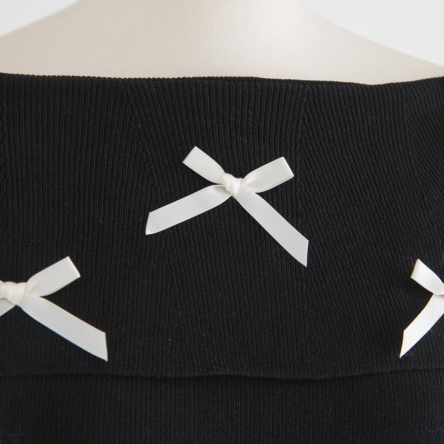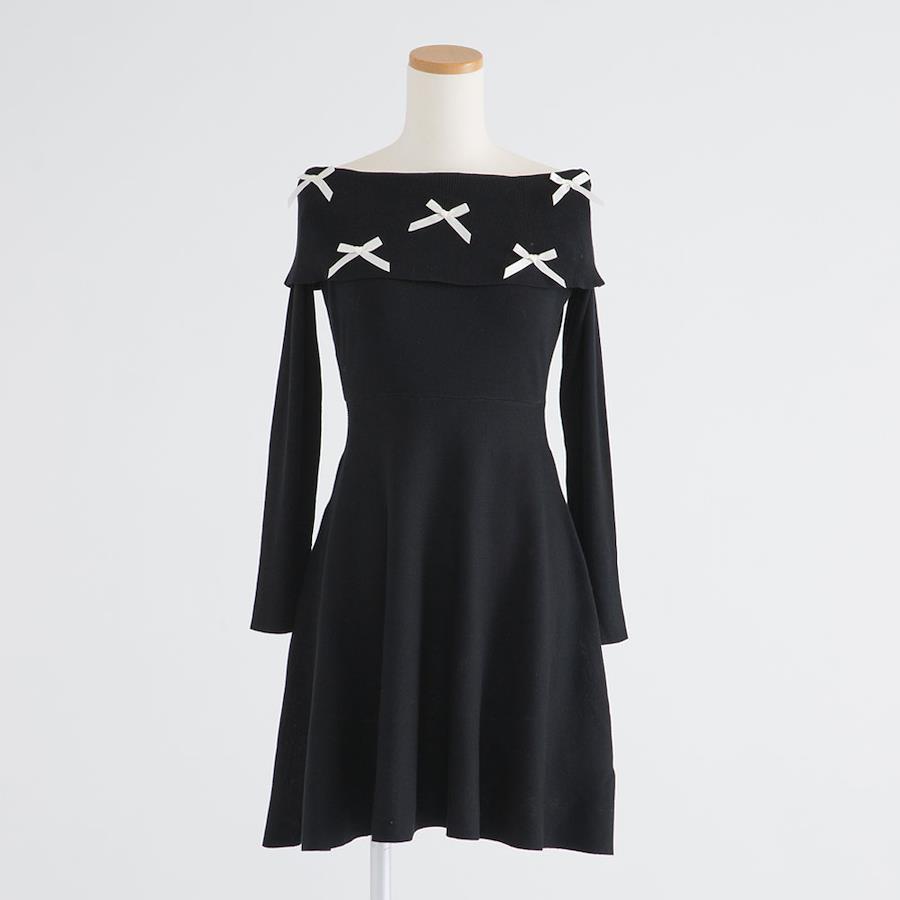 鎖骨が覗くオフショルダーに可愛いリボンがたっぷりあしらわれたフェミニンガーリーなワンピース。