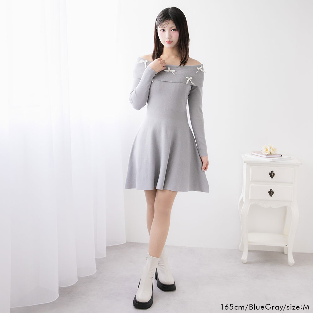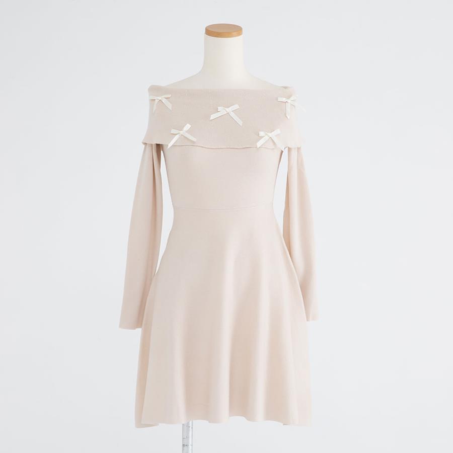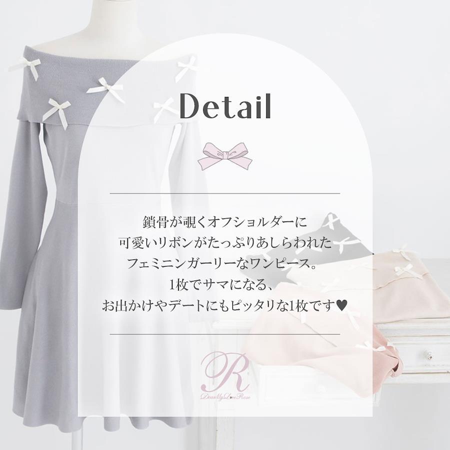鎖骨が覗くオフショルダーに可愛いリボンがたっぷりあしらわれたフェミニンガーリーなワンピース。