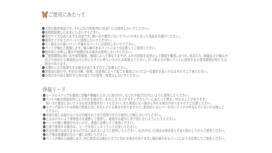 ・犬用の散歩用品です。それ以外の用途には使用しないでください。 ・表示サイズはあくまでも目安です。飼い主様の責任においてペットの体に合った用品をお選びください。 ・散歩前に点検し、傷みや破損がある場合は使用しないでください。