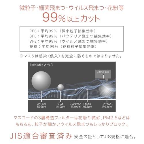 【安心の3層構造】 花粉や黄砂、PM2.5などはもちろん、粒子が細かいウイルス飛沫もしっかりブロック。 JIS適合審査済み。【口元立体構造】 ムレにくく、唇が内側につきにくい口元立体構造を採用し、 形状・素材・仕様にこだわりました。【内側カラー不織布採用】 大多数のマスクユーザーの悩みである「マスク内側の汚れ」。 マスク内側をカラー不織布にすることで メイクや皮脂による汚れが目立たなくなり、 外出先でマスクを外す際にも気になりません。【柔らかいゴム紐】 長時間の使用でも耳が痛くなりにくい平ゴム仕様です。【ファッション性】と【機能性】を両立させ、 より快適で毎日着けたくなるマスクを。