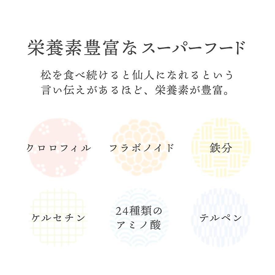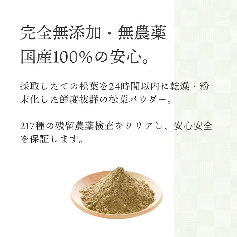 採取したての松葉を24時間以内に乾燥・粉末化した鮮度抜群の松葉パウダーです。世界農業遺産に認定された石川県能登半島の天然の松葉のみを使用しています。アレルギー物質28品目:該当なし(松アレルギーの方は摂取をお控えください)松葉茶としてご利用される場合、約50杯分の分量となります。メーカーの都合によりパッケージデザインが変更される場合がございますので、ご了承ください。【免責事項】メーカーによる商品リニューアルに伴いパッケージ(内容量も含む)変更が行われた場合、新パッケージでお届け致します事ご了承願います。