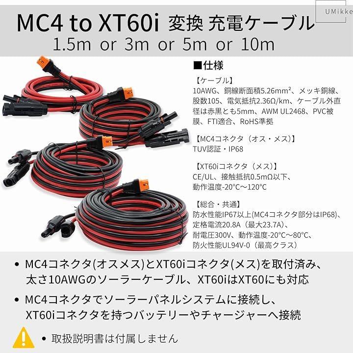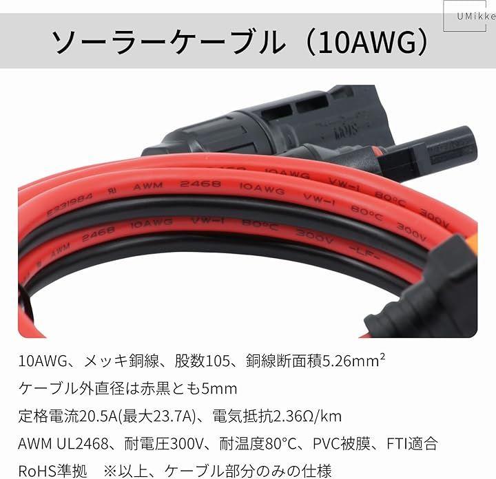 MC4コネクタ(オスメス)とXT60iコネクタ(メス)取付済み、太さ10AWGのソーラーケーブル、XT60iはXT60にも対応「MC4コネクタでソーラーパネルシステムに接続し、XT60iコネクタを持つバッテリーやチャージャーへ接続」「ケーブル」10AWG、銅線断面積5.26mm2、メッキ銅線、股数105、電気抵抗2.36Ω/km、ケーブル外直径は赤黒とも5mm、AWM UL2468、PVC被膜、FTI適合、RoHS準拠「MC4コネクタ(オス・メス)」TUV認証・IP68「XT60iコネクタ(メス)」CE/UL、接触抵抗0.5mΩ以下、動作温度-20℃~120℃「総合・共通」防水性能IP67以上(MC4コネクタ部分はIP68)、定格電流20.5A(最大23.7A)、耐電圧300V、動作温度-20℃~80℃、防火性能UL94V-0