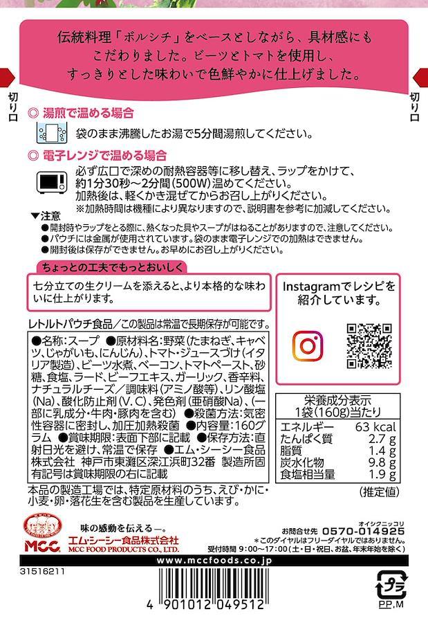 原材料名:野菜(たまねぎ、キャベツ、じゃがいも、にんじん)、トマト・ジュースづけ(イタリア製造)、ビーツ水煮、ベーコン、トマトペースト、砂糖、食塩、ラード、ビーフエキス、ガーリック、香辛料、ナチュラルチーズ/調味料(アミノ酸等)、リン酸塩(Na)、酸化防止剤(V.C)、発色剤(亜硝酸Na)、(一部に乳成分・牛肉、豚肉を含む)