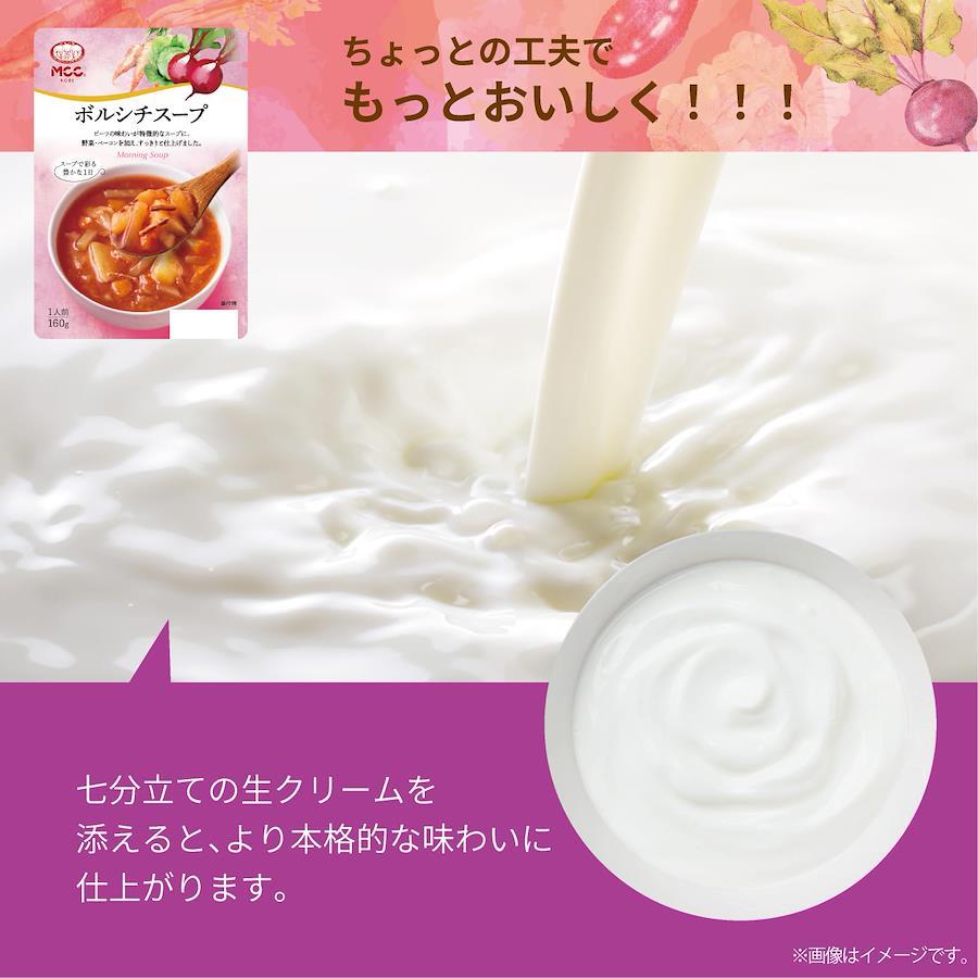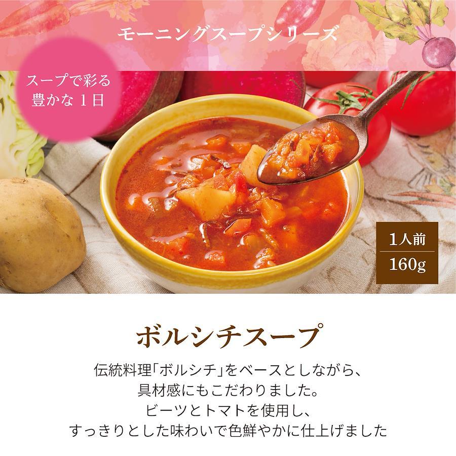 伝統料理「ボルシチ」をベースとしながら、具材感にもこだわりました。ビーツとトマトを使用し、すっきりとした味わいで色鮮やかに仕上げました。素材へのこだわり【ビーフエキス】 ビーフのだしをベースにしています素材へのこだわり【ビーツ】 野菜の甘みに加え、ビーツのうま味・甘みがポイント調理へのこだわり【飲みやすさ】 煮込み料理のボルシチの味わいを表現しつつ、トマトをベースとしてさっぱりと飲みやすく仕上げました【重要】メーカーによる商品リニューアルに伴いパッケージ(内容量も含む)変更が行われた場合、新パッケージでお届け致します事ご了承願います。
