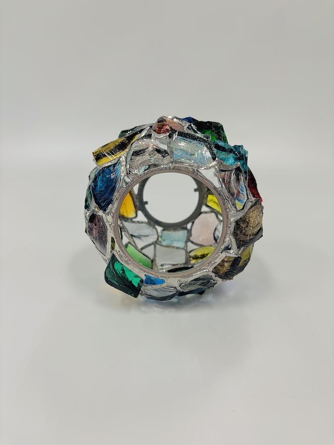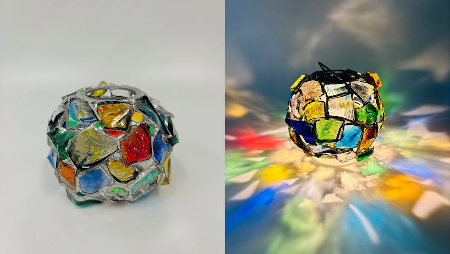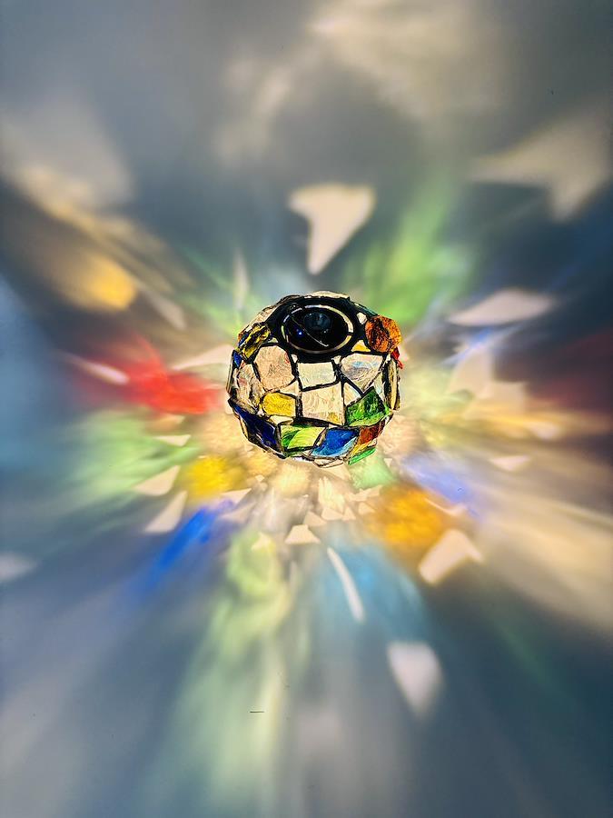 Mebuの「Radiant Orb」は、厚みのある色ガラス(ダルガラス)のかけらを組み合わせて、球状に仕上げたインテリアオブジェです。※写真はイメージです。実際にお届けする商品は一点ずつ異なります。※照明は付属していません。
