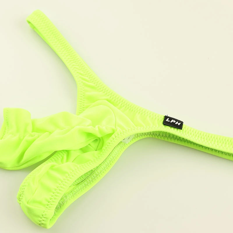 この生地は、発色が豊かでハリがあり、触り心地が気持ち良く、さらに伸縮性が高いストレッチ素材が特徴のE6000生地を使用したTバックビキニになります。フロントは独立性や開放感のあるゾウさんタイプになります。ゾウさんはサイドギャザー入りの貫通型になり男性自身を優しく包み込んでくれます。