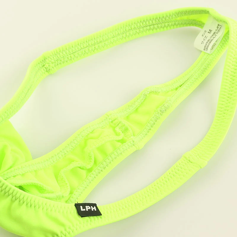 この生地は、発色が豊かでハリがあり、触り心地が気持ち良く、さらに伸縮性が高いストレッチ素材が特徴のE6000生地を使用したTバックビキニになります。フロントは独立性や開放感のあるゾウさんタイプになります。ゾウさんはサイドギャザー入りの貫通型になり男性自身を優しく包み込んでくれます。