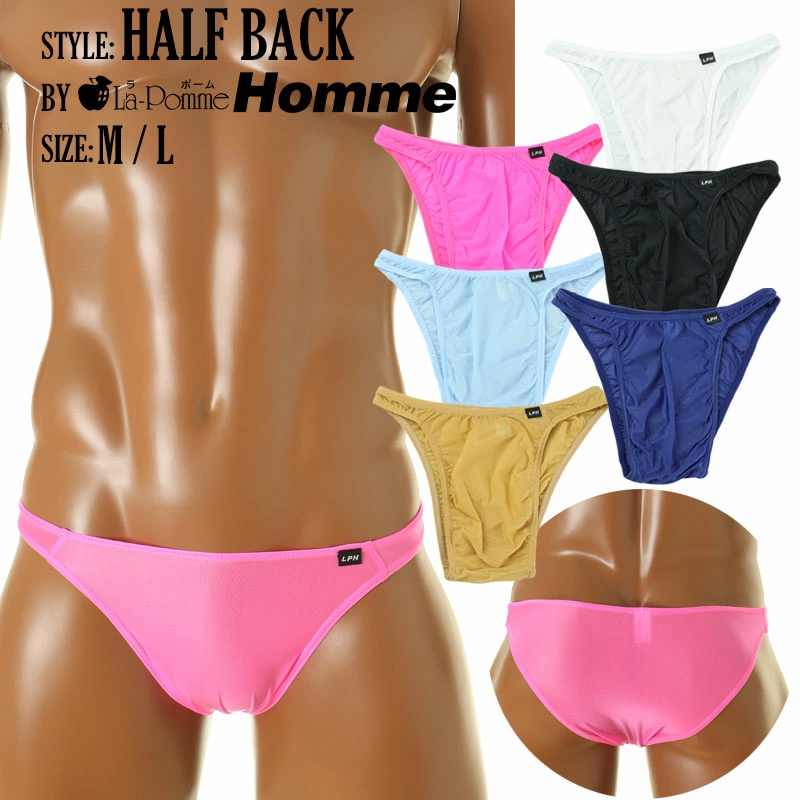 伸縮性に優れ薄手で透け感がありもっちりとした肌触りが特徴のハーフバックビキニ。フロントはノーシームになり男性自身を収めやすくする為に立体的に縫製された下着になります。