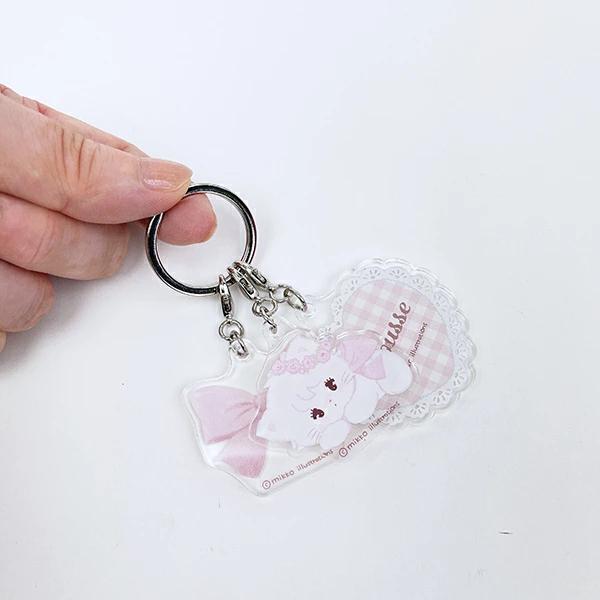 SNSなどで話題の「mikko illustrations」の3連アクリルキーホルダーです。ムースとリボンとハートの形の3連キーホルダー♪セットでも、それぞれ取り外してチャームとしても使えてポーチやお家の鍵などに付けられる♪