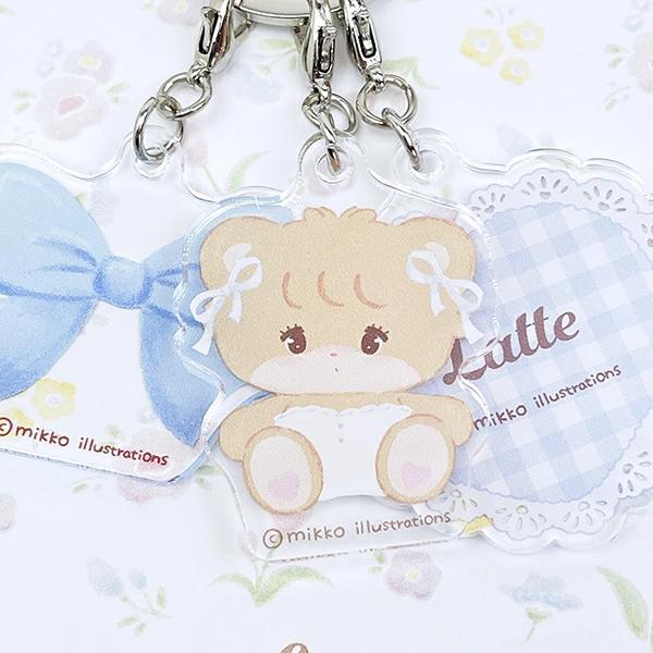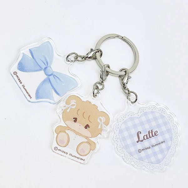 SNSなどで話題の「mikko illustrations」の3連アクリルキーホルダーです。ラテとリボンとハートの形の3連キーホルダー♪セットでも、それぞれ取り外してチャームとしても使えてポーチやお家の鍵などに付けられる♪