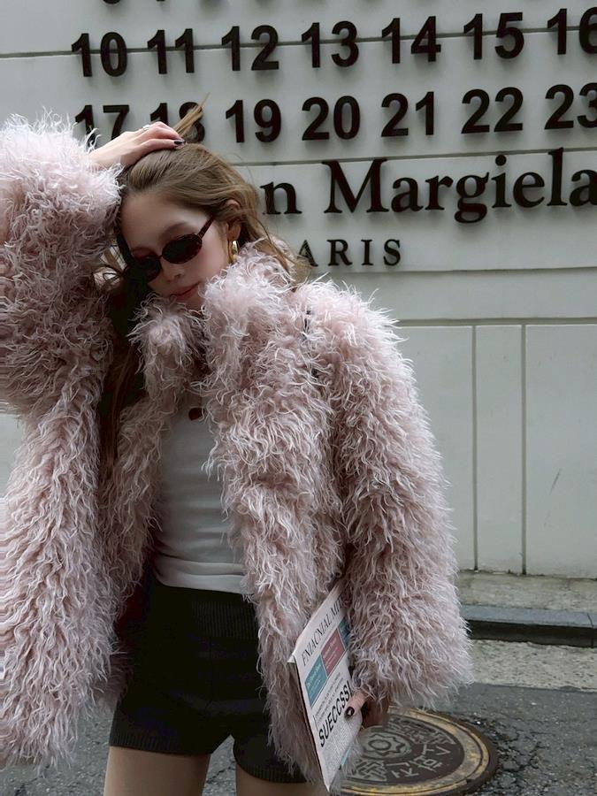 ◼︎主役級のファーコートボリュームがありながらも、すっきり見えるバランス感で、羽織るだけでコーデが完成♪ふわっと空気を含んだようなファーで、写真・SNSでも映え、冬コーデに’’非日常’’をプラスする一着。